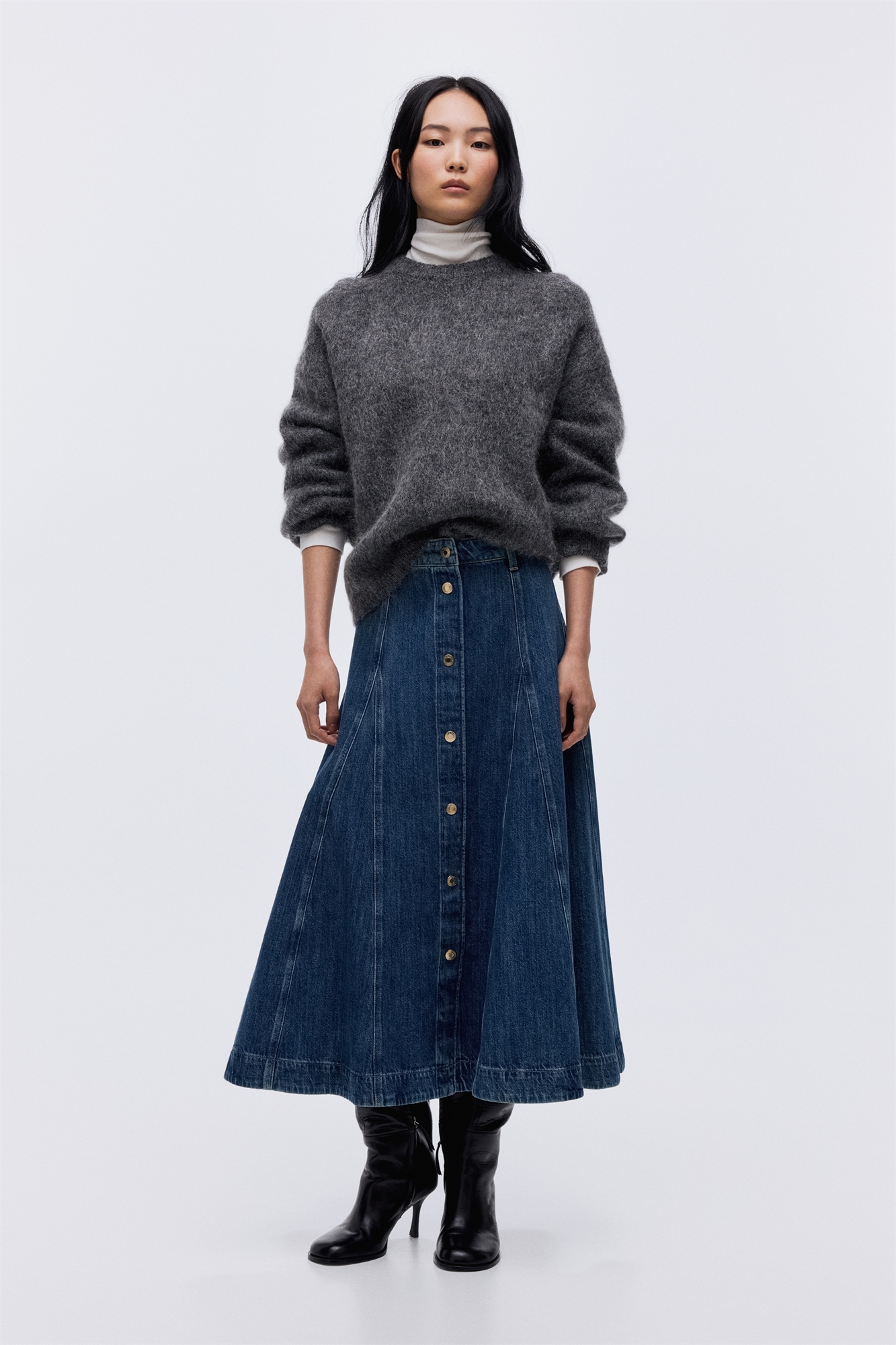 Юбка из хлопкового денима с высокой талией и пуговицами спереди. А-линия силуэта с годе-плиссе для придания дополнительного объема.
