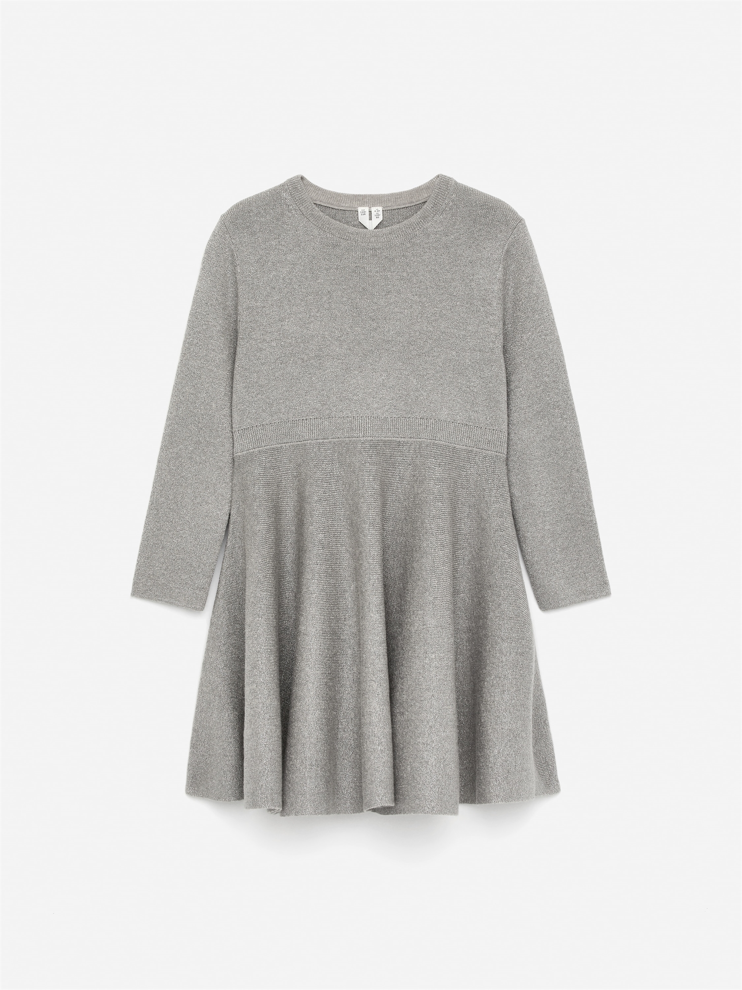 Платье из трикотажа с люрексовой нитью для создания блестящего эффекта. Фасон с длинными рукавами, лентами на талии и горловине и объемной юбкой.