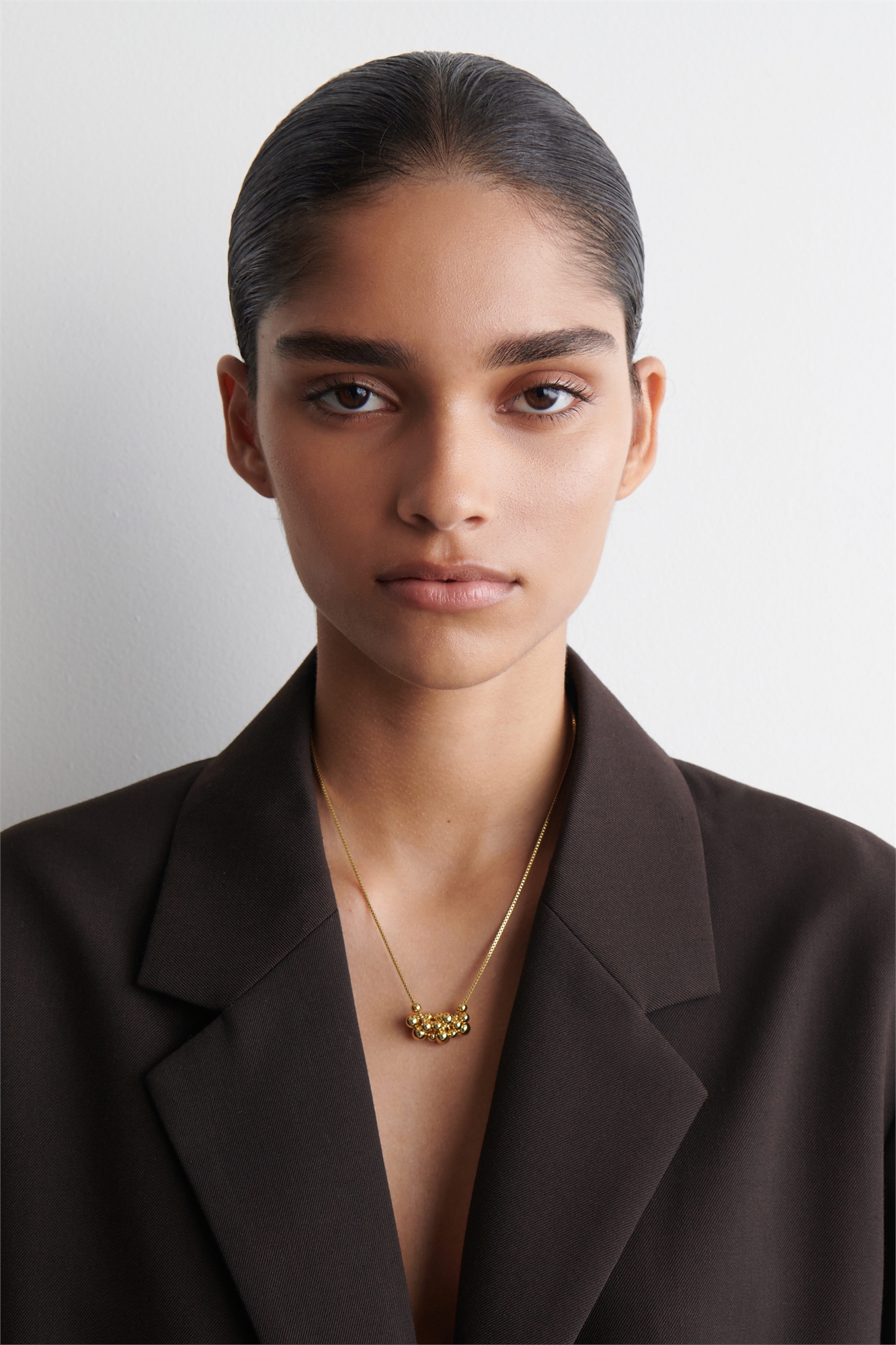 Коллекция украшений COS делает акцент на выразительных, современных силуэтах. Это ожерелье, изготовленное из позолоченной переработанной латуни, украшено гроздью сфер, которые падают с регулируемой цепочки. Его можно носить как в одиночку, так и в сочетании с другими изделиями. Застежка-лобстерБрасс - универсальный материал, который может быть переработан множество раз без потери своих свойств Оболочка: 100% переработанная латунь Post-consumer. Покрытие: 100% золото. Без учета отделки