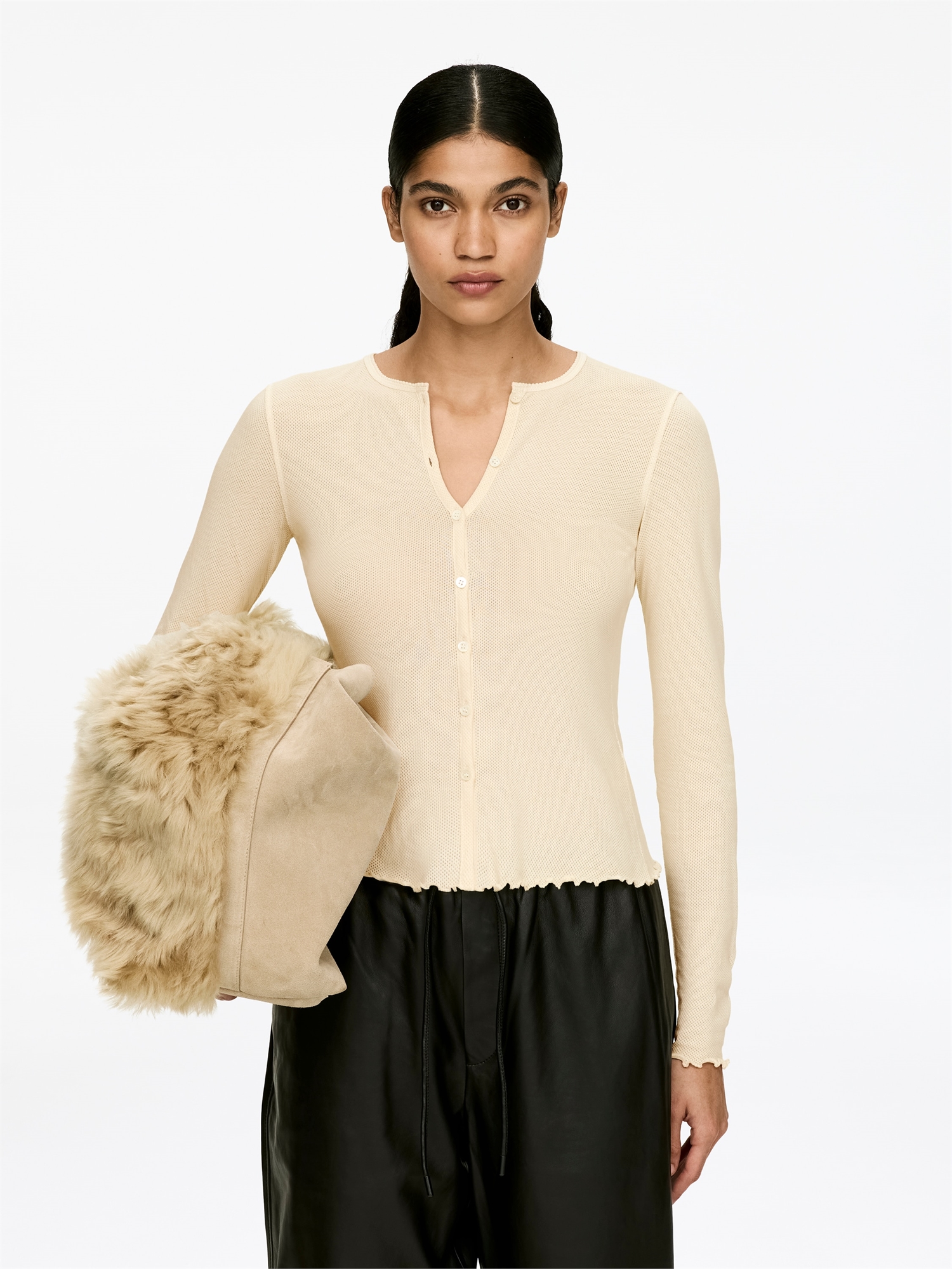 Топ из сетки с застежкой на пуговицы спереди, нежным гребешковым краем по вырезу горловины и отделкой babylock на манжетах и подоле. Облегающий крой.