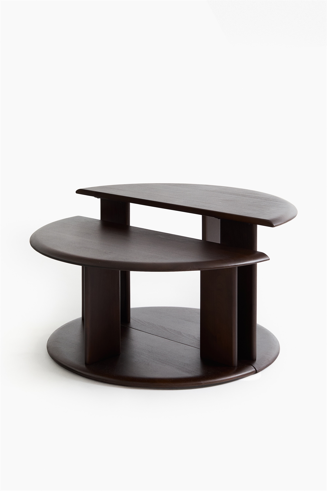 Набор из двух кофейных столиков из дерева полукруглой формы со скошенными краями, придающими им изысканный вид. Можно поставить вместе или по отдельности. Диаметр основания 70 см. Диаметр столешницы 80 см. Высота маленького столика 34 см. Высота большого столика 43 см.