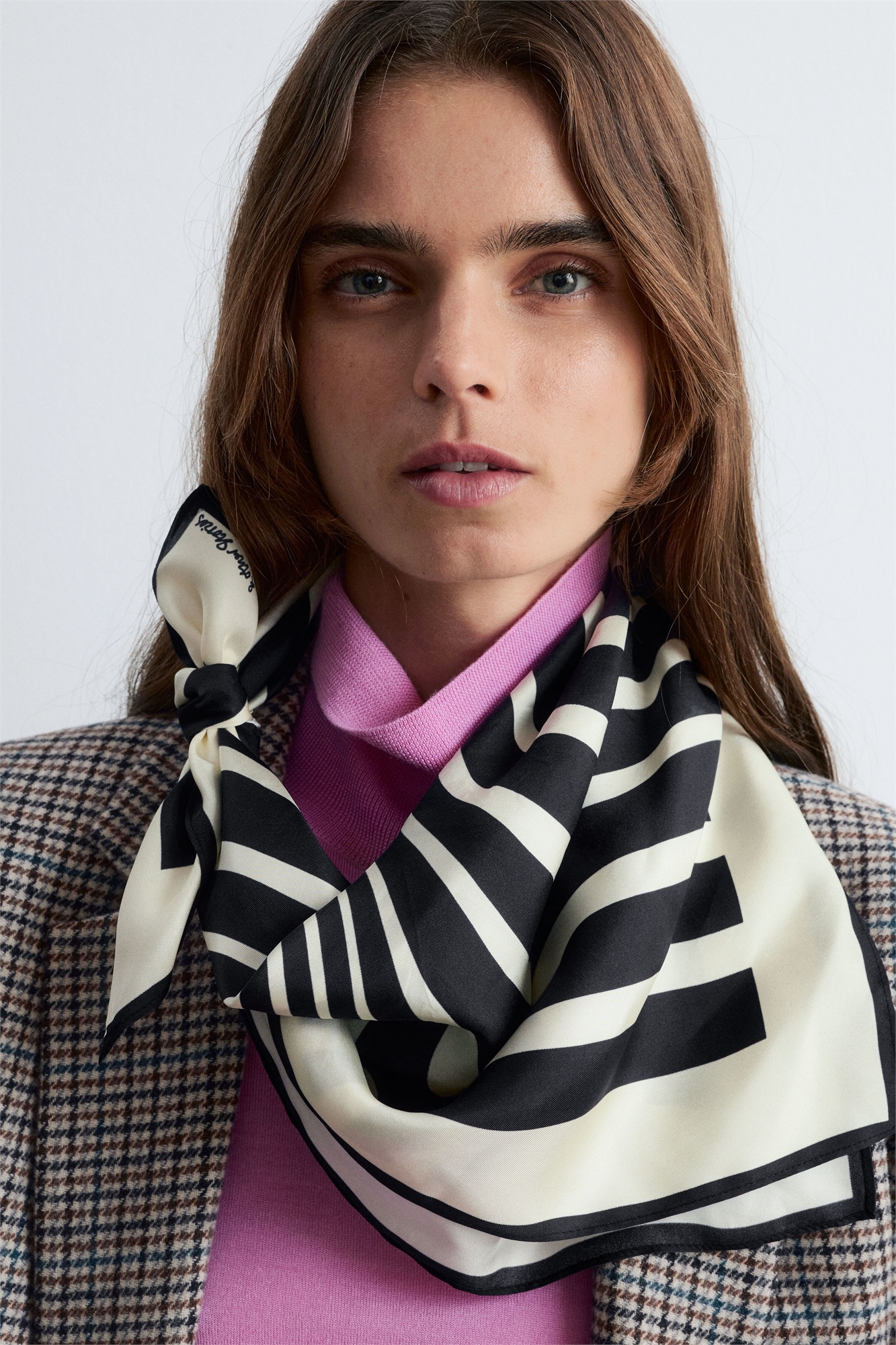 Этот легкий квадратный шарф из мягко драпирующейся шелковой саржи тутового цвета украшен графическим принтом.