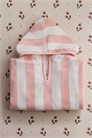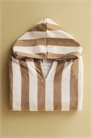 Полотенце-накидка из мягкой хлопковой махровой ткани с полосатым узором и капюшоном. Открытые боковые стороны с узкими завязками.