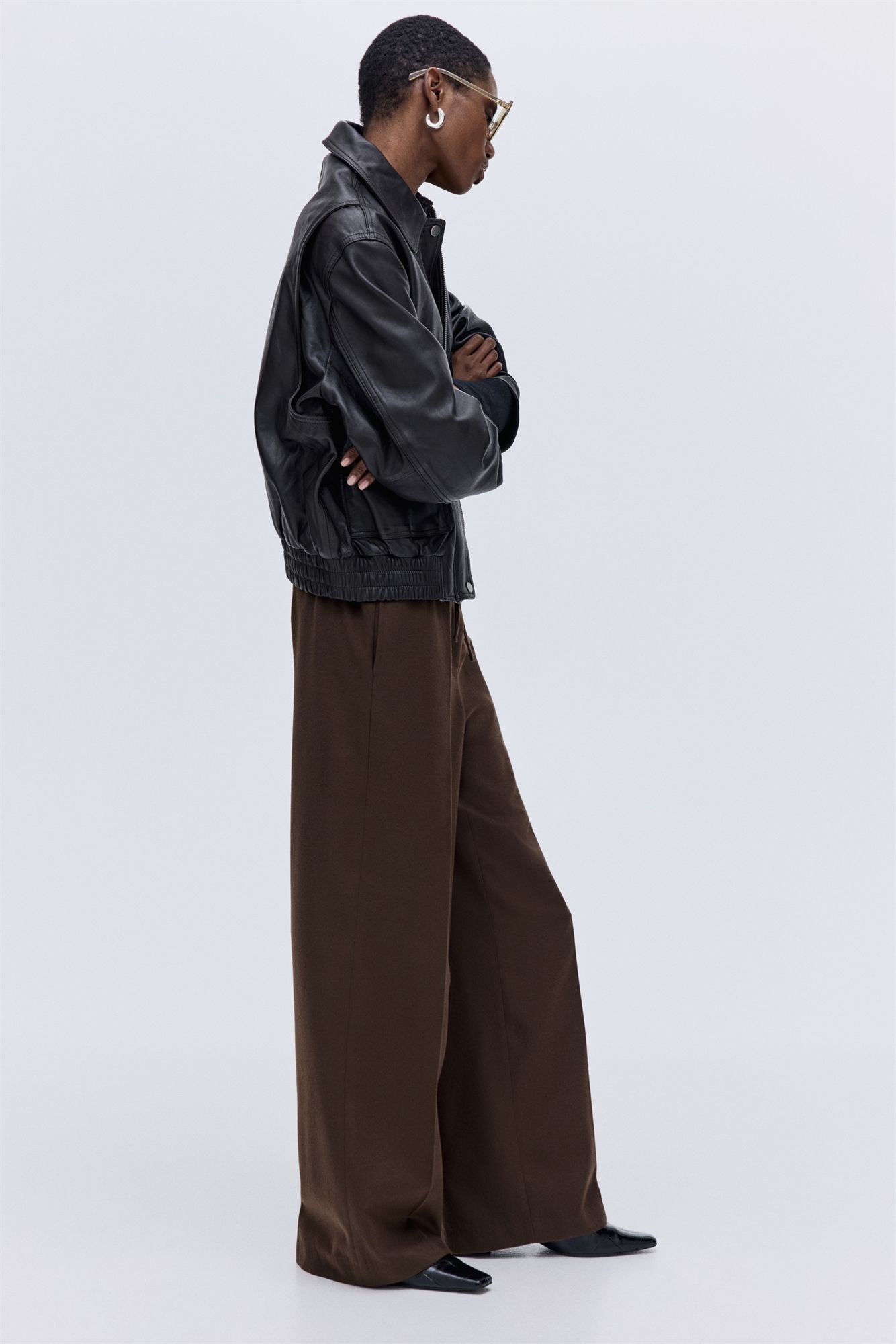 Брюки из тканого материала с эластичным утягивающим поясом и неброскими боковыми карманами. Широкие ноги с заглаженными складками спереди и сзади.