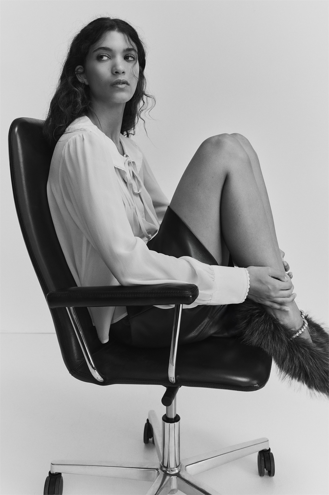 Блузка из прозрачной вискозы с воротником "Питер Пэн" с узкой кружевной отделкой, узкими завязками в верхней части и пуговицами спереди. Завязки спереди и длинные пышные рукава с манжетами на пуговицах и узкой кружевной отделкой.