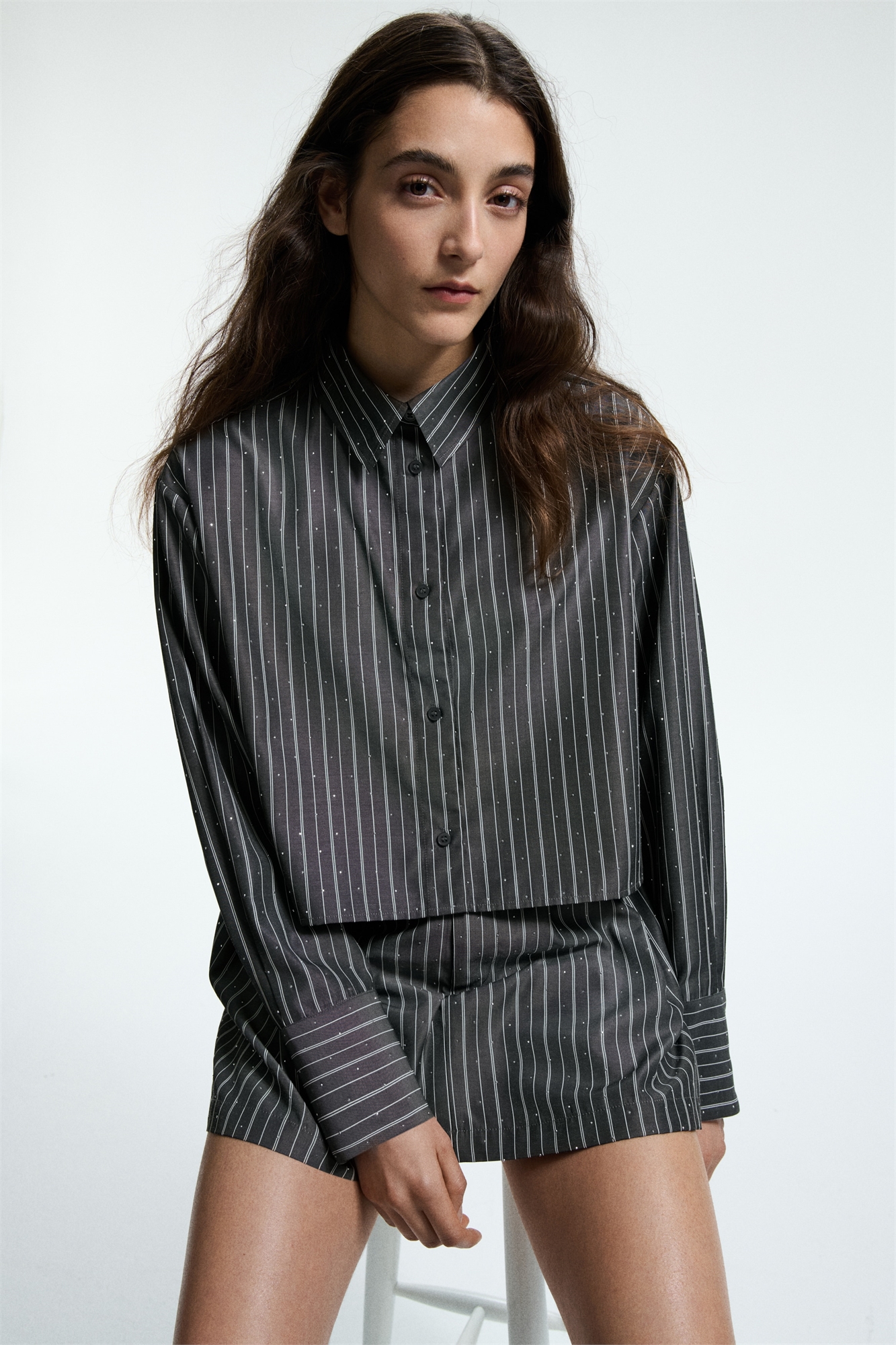 Короткая рубашка из тканого материала со стразами по всей поверхности. Воротник, пуговицы спереди и ярмо сзади. Приталенный силуэт с мягко спущенными плечами, длинные рукава с манжетами на пуговицах и прямой подол.