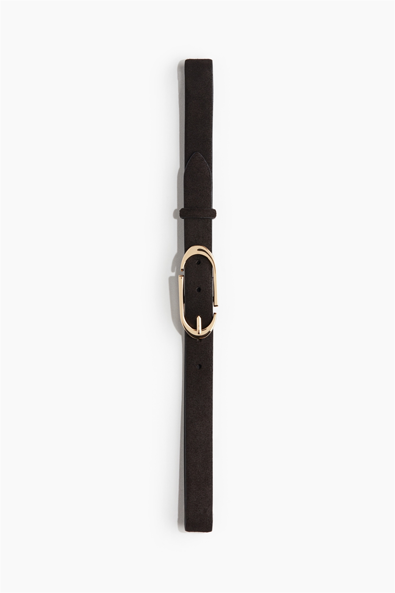 Узкий ремень из кожи с овальной металлической пряжкой.