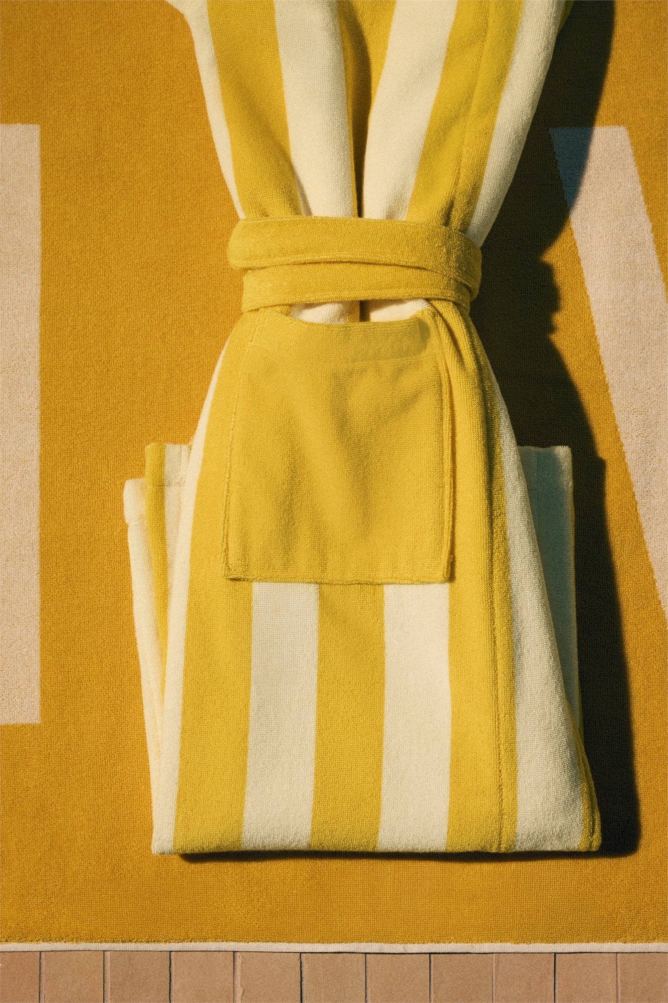 Халат из мягкой хлопковой махровой ткани с полосатым узором. Имеет накладные карманы спереди и пояс на завязках на талии.