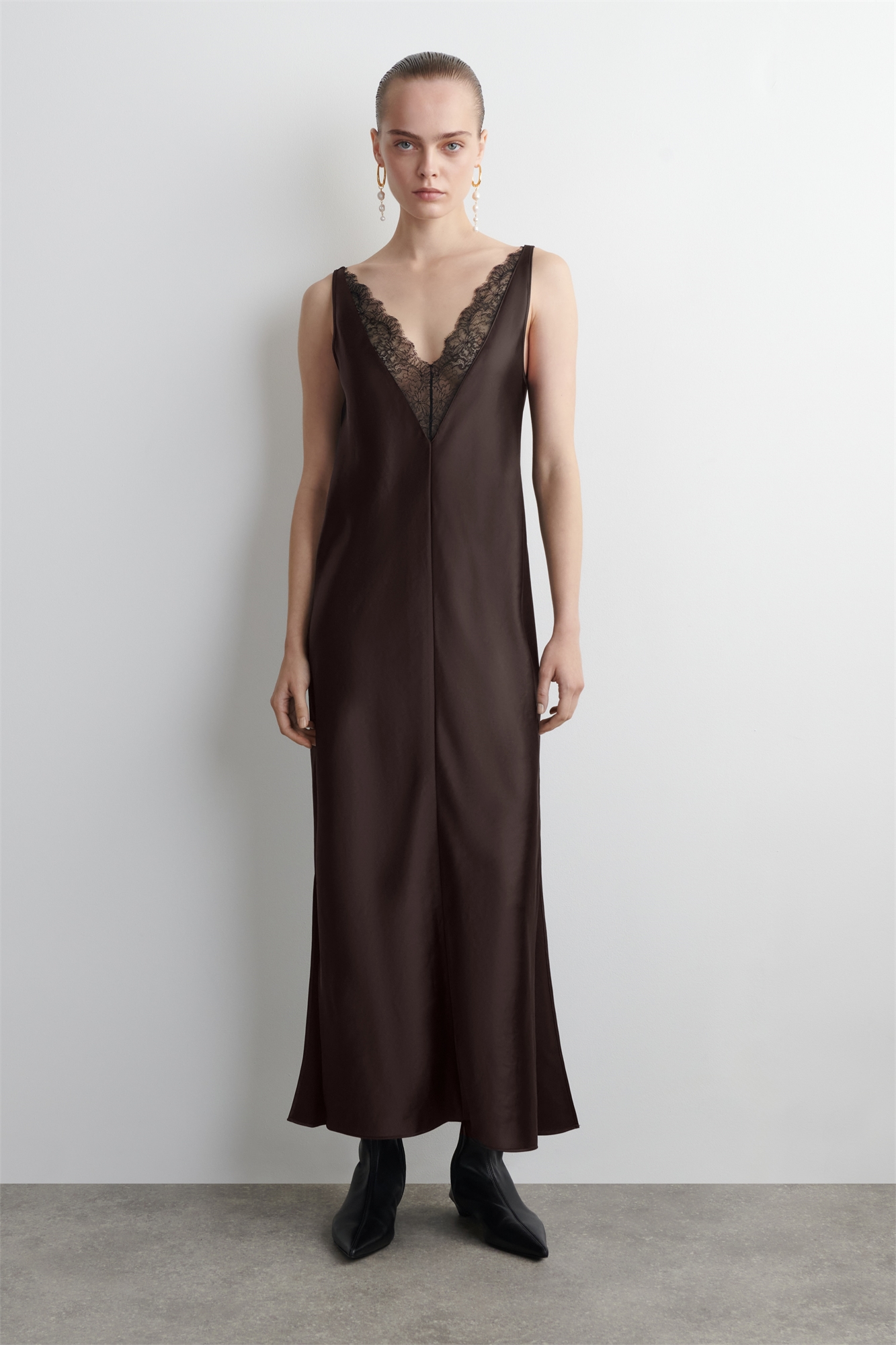 Это атласное платье на бретелях придает современную женственность даже самым простым образам. Модель шоколадно-коричневого цвета с нежным контрастным кружевом вдохновлена классическим нижним бельем и имеет крой по косой, что делает ее особенно струящейся. Изысканные детали включают французские швы и деликатный приталенный подол. Регулярный кройПереработанный полиэстер - это полиэстер, изготовленный из ПЭТ-бутылок или текстильных отходов. ПЭТ-бутылки или текстильные отходы подвергаются механической переработке и перерабатываются в новую пряжу Верхний материал: 100% переработанный полиэстер. Детали не учитываются/Машинная стирка Длина по спинке в размере ЕС 36 = 94 см / Модель носит размер ЕС 36