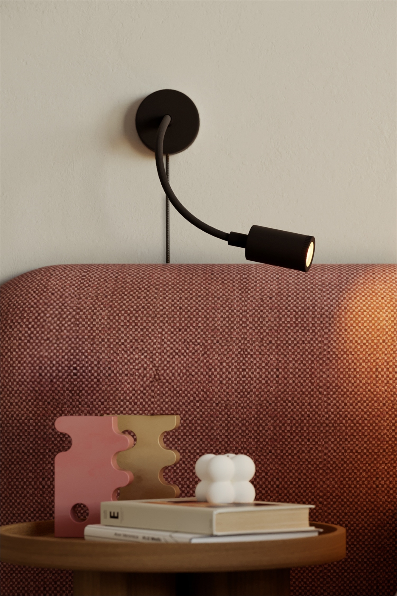 Современный настенный светильник. Гибкий кронштейн с тканевой обивкой для легкого выравнивания света. Кабель в тканевой оболочке с пластиковым выключателем. Цоколь GU10 для ламп MR11 с максимальной высотой 46 мм. Включая точечный светильник: 3,2 Вт 260 Лм. Длина кронштейна и точечного светильника: 38 см. Длина кабеля: 210 см (150 см от вилки до выключателя + 60 см от выключателя до козырька).