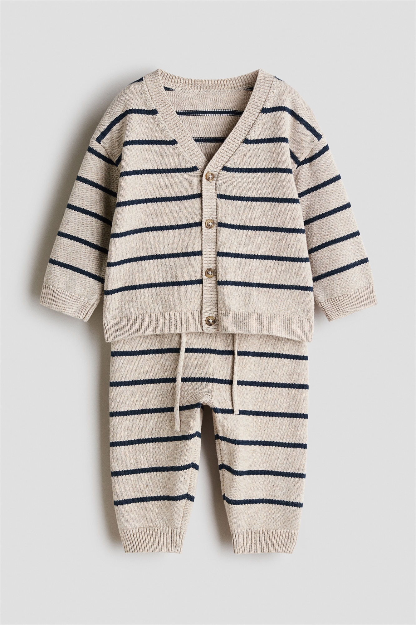 Комплект из кардигана и джоггеров из мягкого хлопка тонкой вязки. Кардиган с V-образным вырезом, пуговицами спереди и спущенными плечами. Окантовка в рубчик вокруг проймы, на манжетах и подоле. Джоггеры с эластичным утягивающим поясом и ребристыми краями.