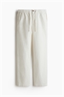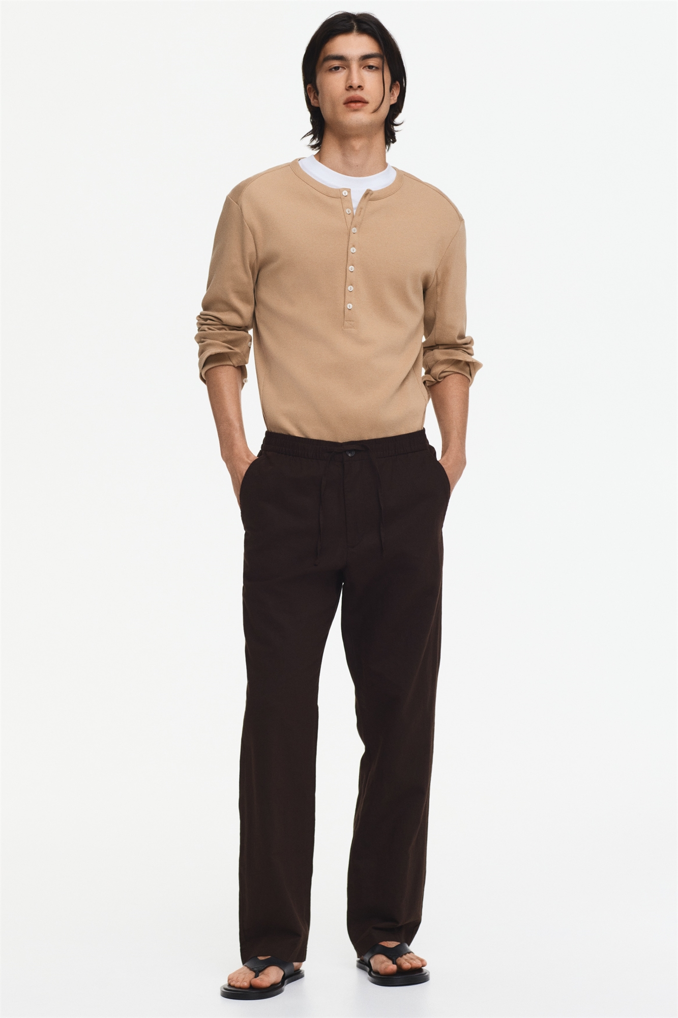 Брюки из воздушной хлопчатобумажной и льняной ткани с закрытой резинкой и шнурком на талии, застежкой-молнией и пуговицей, боковыми карманами и задним карманом с отворотом. Классический крой для удобства ношения и классического силуэта. Смесь хлопка и льна сочетает в себе мягкость хлопка и прочность льна, создавая красивую текстурированную ткань, которая дышит и идеально драпируется.