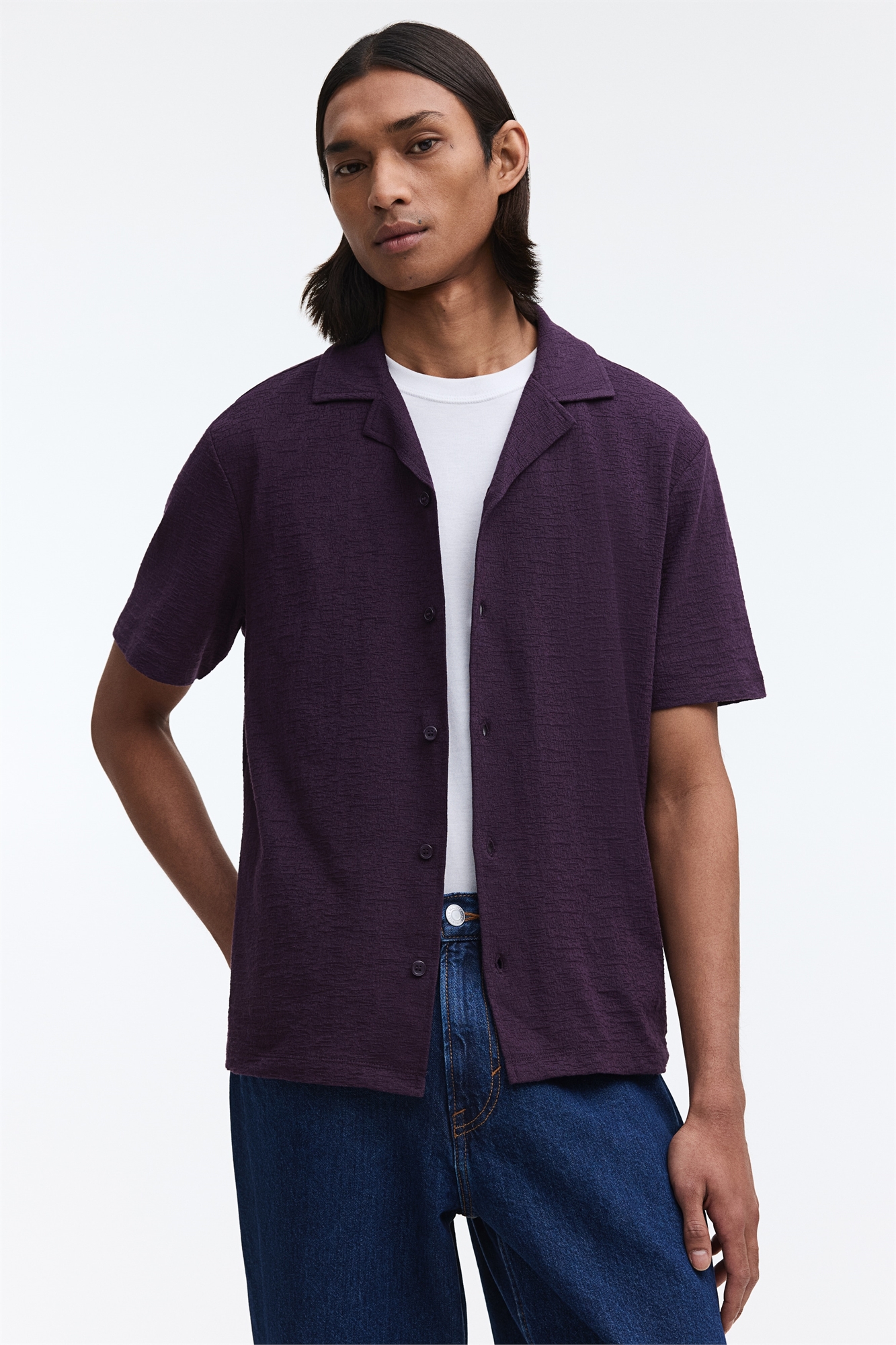 Рубашка с короткими рукавами из жаккардового джерси из смесовой хлопковой ткани с воротником-стойкой, французским передом и прямым подолом. Классический крой для комфортной носки и классического силуэта.