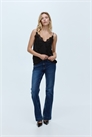 Джинсы с 5 карманами из денима с легким стретчем для комфорта. Джинсы Bootcut с зауженной посадкой от талии до бедра, расклешенные от колена до подола. Регулярная талия, застежка на молнию и пуговицу, заутюженные складки спереди и сзади. Обычная длина, рассчитанная на то, чтобы доходить до верхней части стопы, практически не оставляя следов. Подходят ко всему: от кроп-топов до толстого трикотажа.
