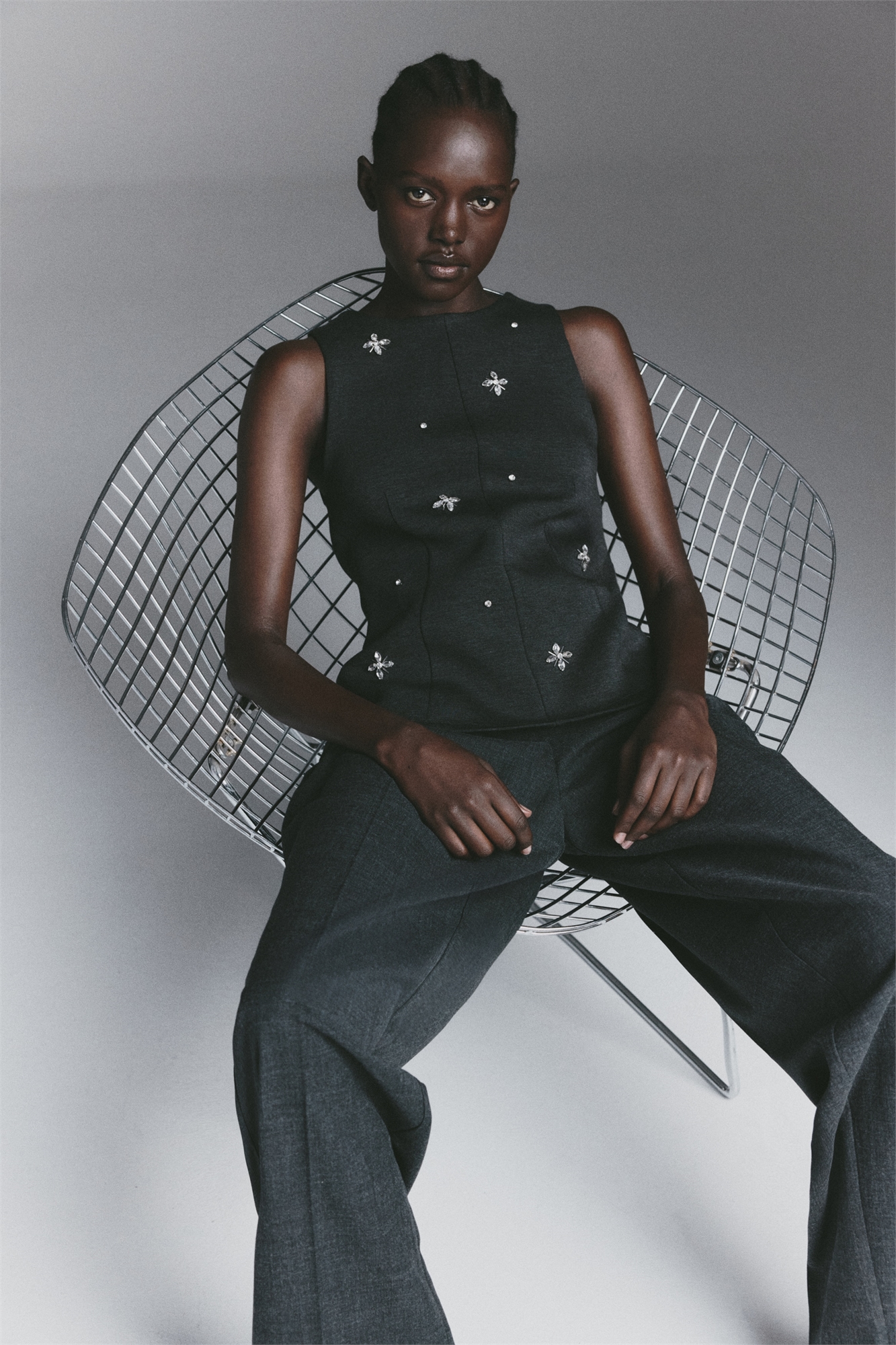 Топ без рукавов из ткани скуба с украшением из страз спереди. Формообразующие швы спереди и сзади и потайная застежка-молния сзади.