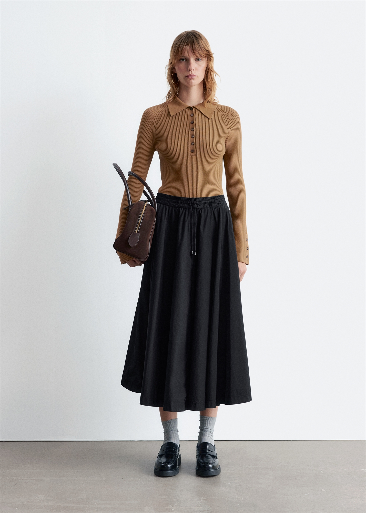 Эта юбка-миди изготовлена из саржевой нейлоновой ткани. Она имеет широкий А-линейный силуэт с мягкими складками, эластичный пояс с завязками и застежку-молнию, проходящую по всей длине спереди. Регулярная талия Карманы в боковых швах Длина юбки: 80 см / 31,5" (размер S)