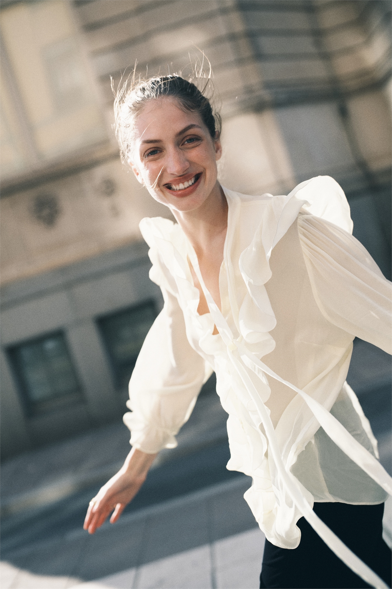 Блузка оверсайз из воздушной вискозы с воротником-бантом и V-образной проймой спереди. Застежка на пуговицах спереди и отделка оборками спереди, переходящая на плечи сзади. Длинные рукава-баллоны с узкой резинкой у запястий и манжетами с оборками.