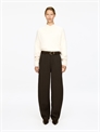 Брюки с бочкообразными штанинами, средней талией и непринужденным кроем. С косыми боковыми карманами, задними втачными карманами и вытачками на подоле.