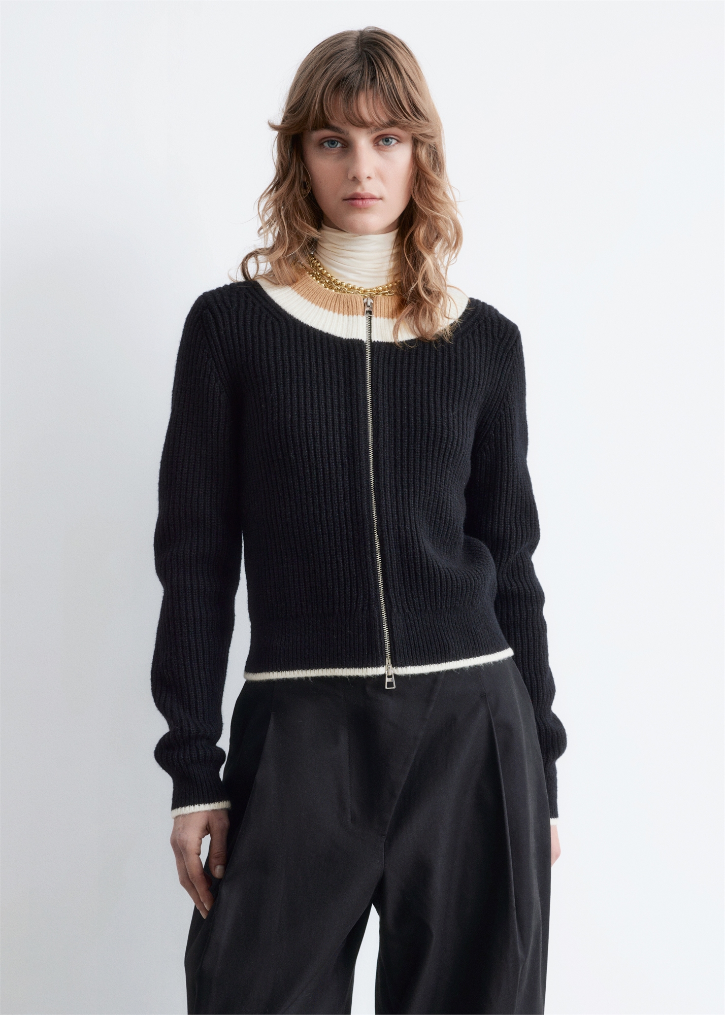 Этот кардиган связан из шерстяно-хлопковой смеси в рубчик. Прямой силуэт, отделка контрастного цвета и двусторонняя застежка-молния. 54% шерсти RWS TE-00047206 Длина кардигана: 51,5 см / 20,3” (размер S)