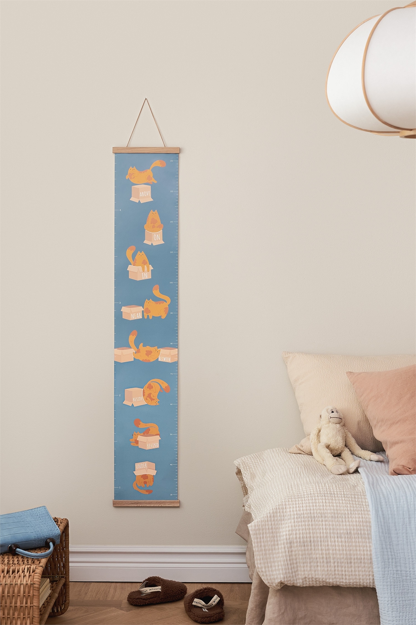 Наблюдайте, как растет ваш ребенок с нашей уникальной и очаровательной измерительной палочкой. На этой измерительной палочке изображены кот и коробка, а также английские предлоги. Вы можете добавлять свои собственные заметки и ставить цели по мере роста вашего ребенка. Размер мерной палки 118 × 21 см, а ее длина варьируется от 30 до 140 см - просто повесьте ее на высоте 30 см от пола. В комплект входит соответствующая дубовая доска для плакатов размером 22 см.