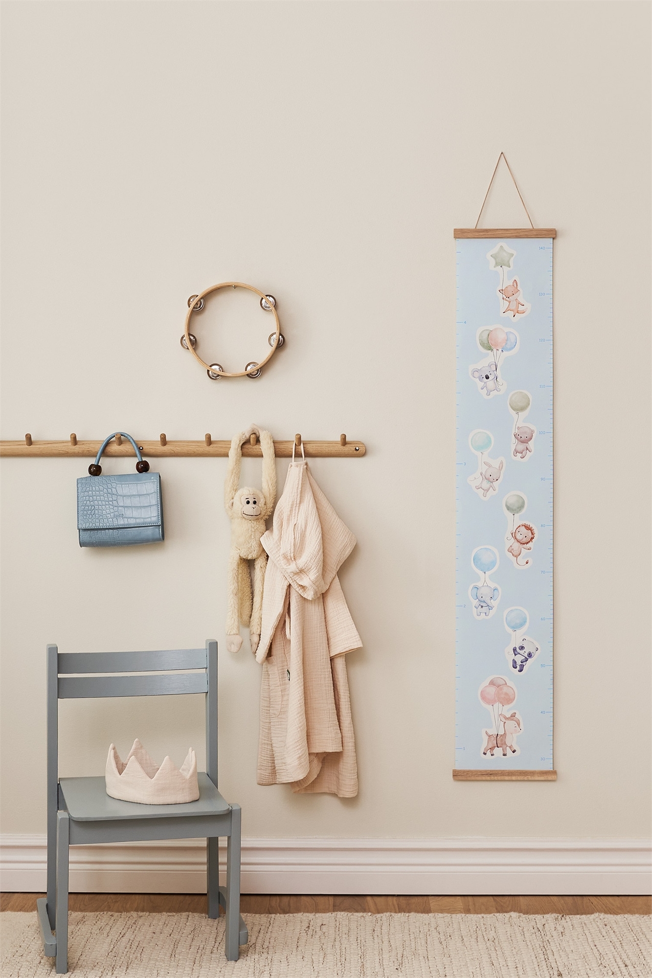 Наблюдайте за ростом своего ребенка с помощью нашей уникальной и очаровательной измерительной палочки. На этой измерительной палочке изображены иллюстрированные животные, подвешенные на воздушных шариках. Вы можете добавлять свои собственные заметки и ставить цели по мере роста вашего ребенка. Размер измерительной палки 118 × 21 см, а ее длина варьируется от 30 до 140 см - просто подвесьте ее на высоте 30 см от пола. В комплект входит соответствующая доска для плакатов из дуба размером 22 см.