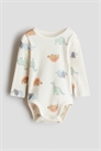 Боди-комбинезон из мягкого хлопкового джерси с принтом. Круглый вырез с отделкой, застежка на одном плече и длинные рукава. Скрытые застежки внизу для удобства переодевания.