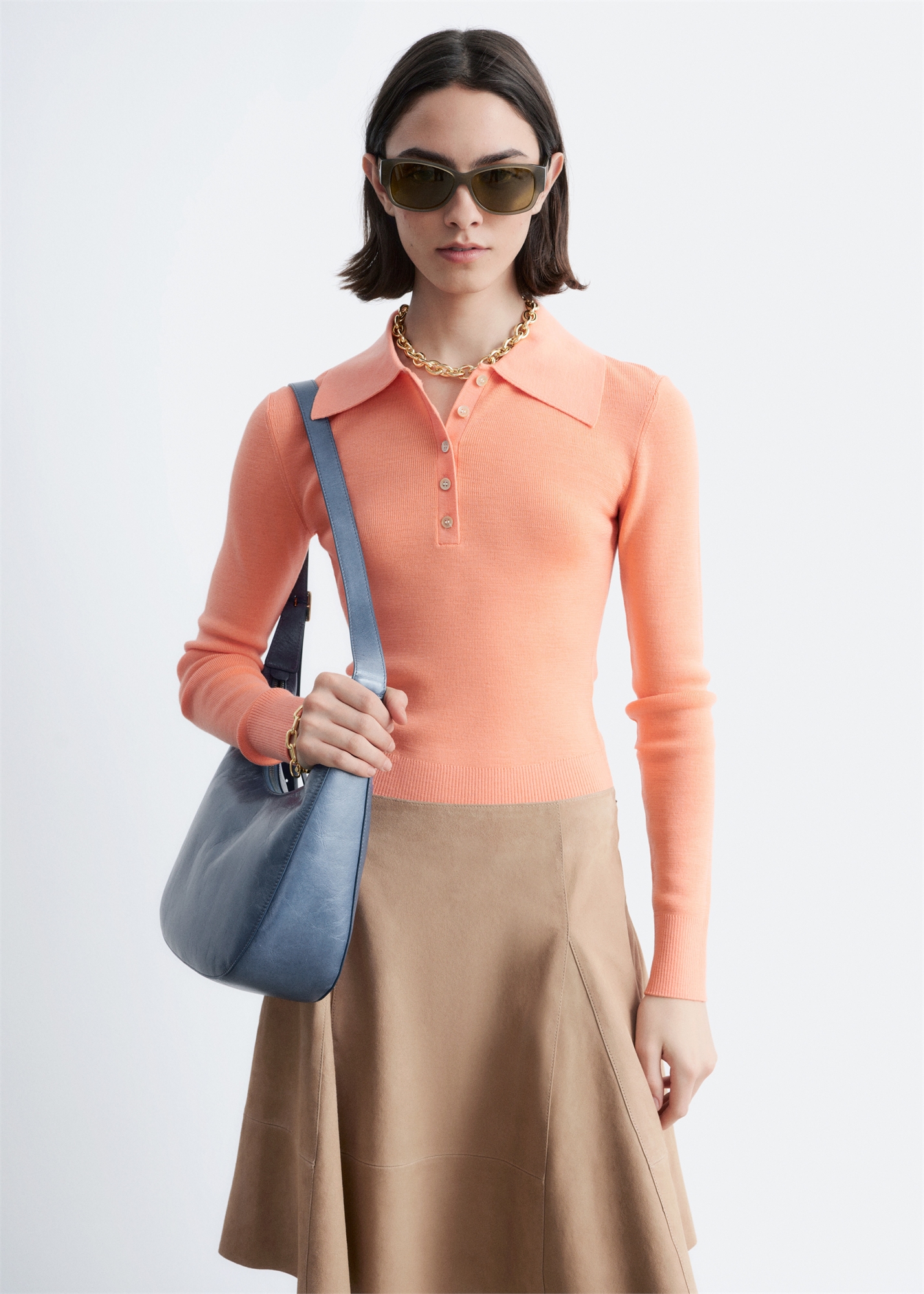 Этот длиннорукавный поло из мягкой мериносовой шерсти с ребристой вязкой имеет короткую облегающую форму, классический воротник и полупланку с пуговицами. Манжеты и подол украшены широкой ребристой вязкой. Длина топа: 50 см (размер S).