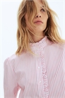 Приталенная блузка из хрустящего поплина с воротником-бантом и отделкой из оборок, продолжающейся по пуговичной ленте. Пуговицы спереди, длинные рукава со складками на плечах и манжеты с оборкой, разрез и пуговица.