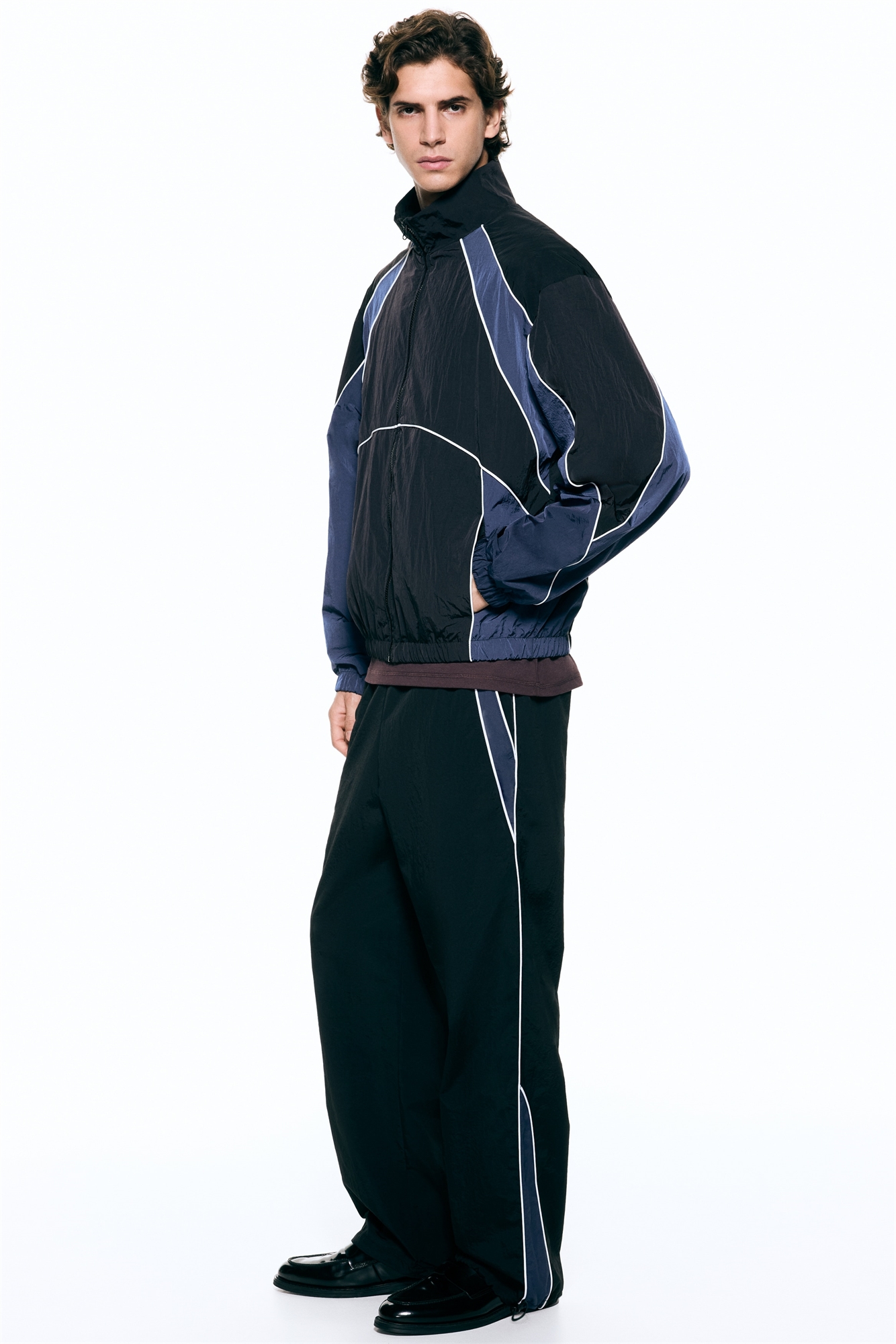 Спортивная куртка в стиле колор-блок из хрустящего нейлона с контрастными цветными вставками. Воротник-стойка, застежка-молния спереди, незаметные боковые карманы и эластичные манжеты и подол. Сетчатая подкладка.