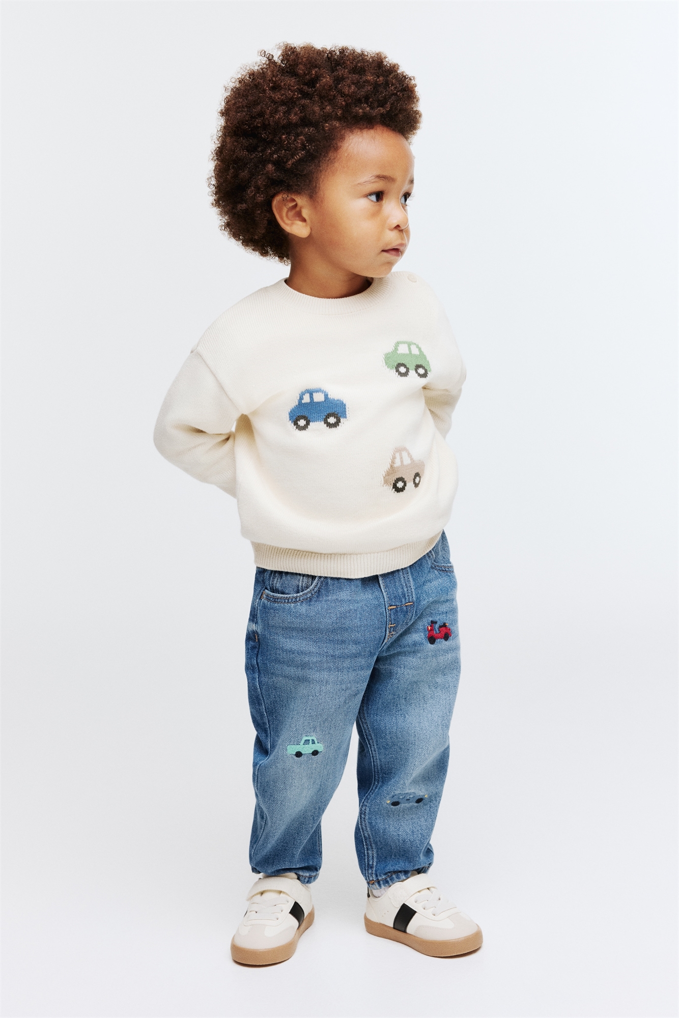 Джинсы с 5 карманами из мягкого хлопкового денима с вышитыми мотивами спереди. Регулируемая резинка на талии и фальшивая ширинка с кнопкой.