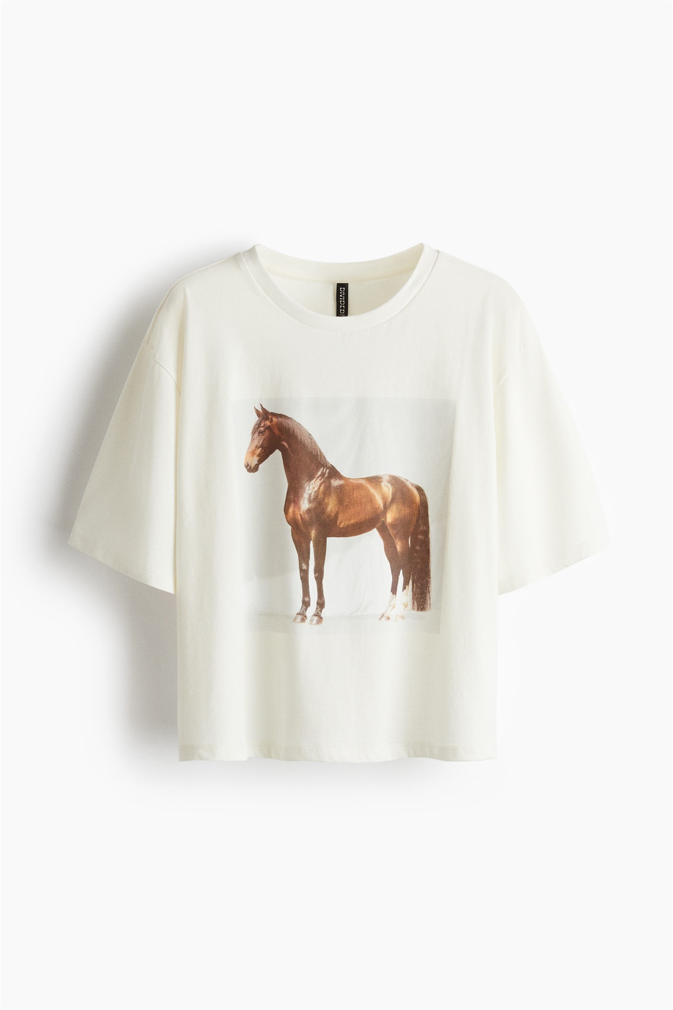 Свободная футболка из мягкого хлопкового джерси с принтом спереди. Ребристая отделка по вырезу горловины и спущенные плечи.