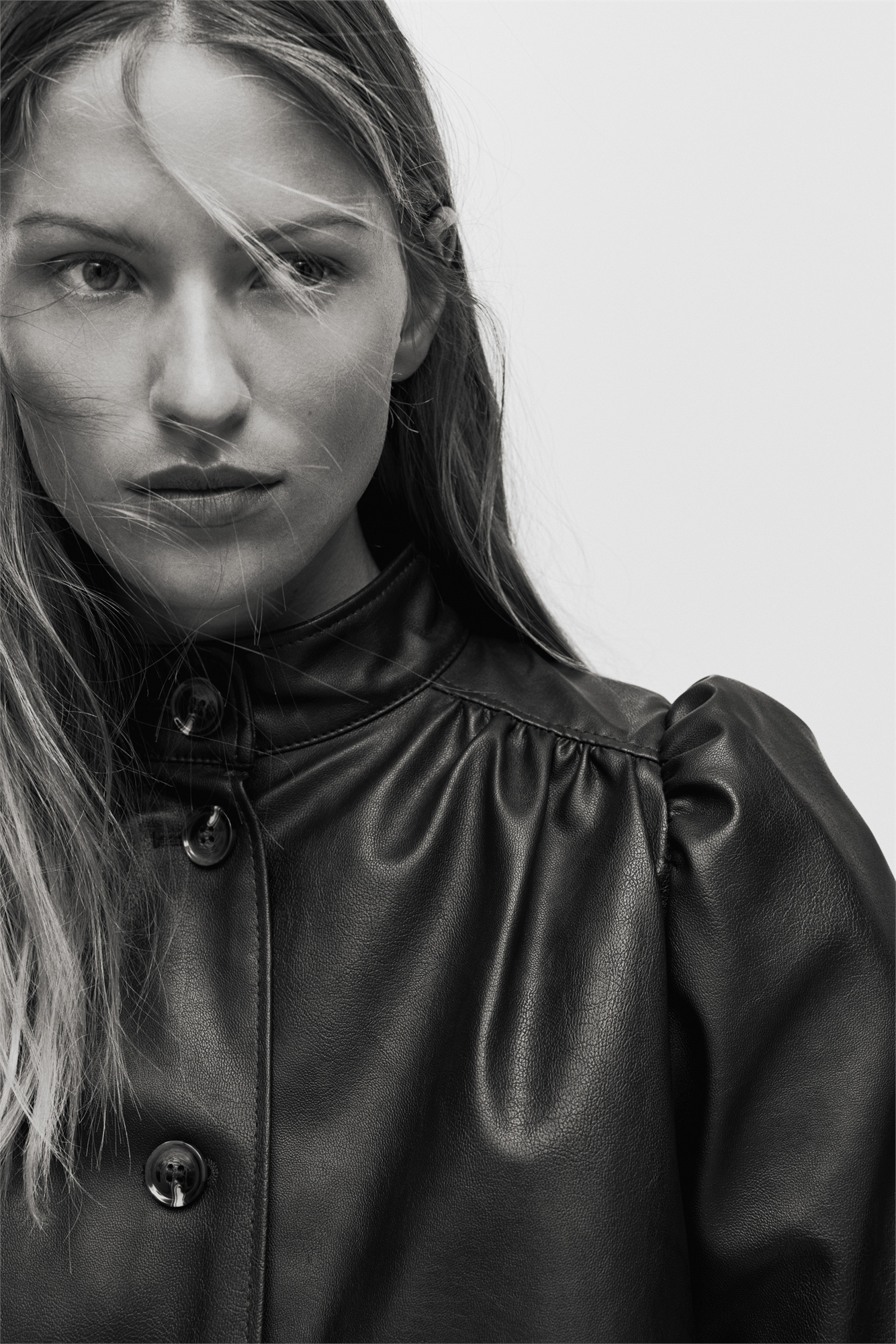 Куртка из материала с покрытием, воротник-стойка, застежка на пуговицах и боковые карманы. Длинные рукава со складками спереди и сзади и манжеты на пуговицах. На подкладке.