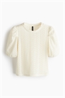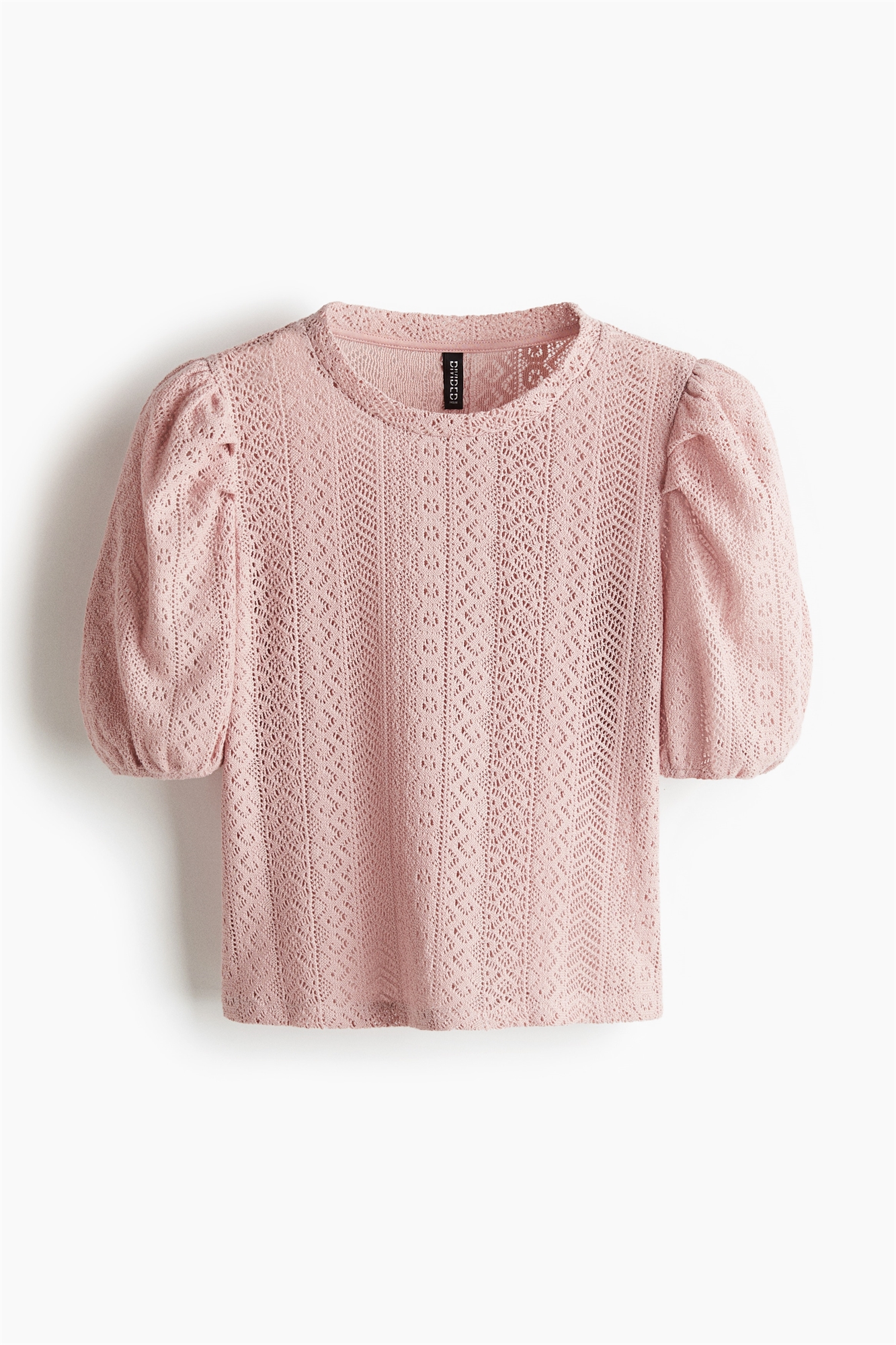 Топ из мягкого кружевного трикотажа с круглым вырезом и объемными рукавами-пуховиками с узкими эластичными манжетами.