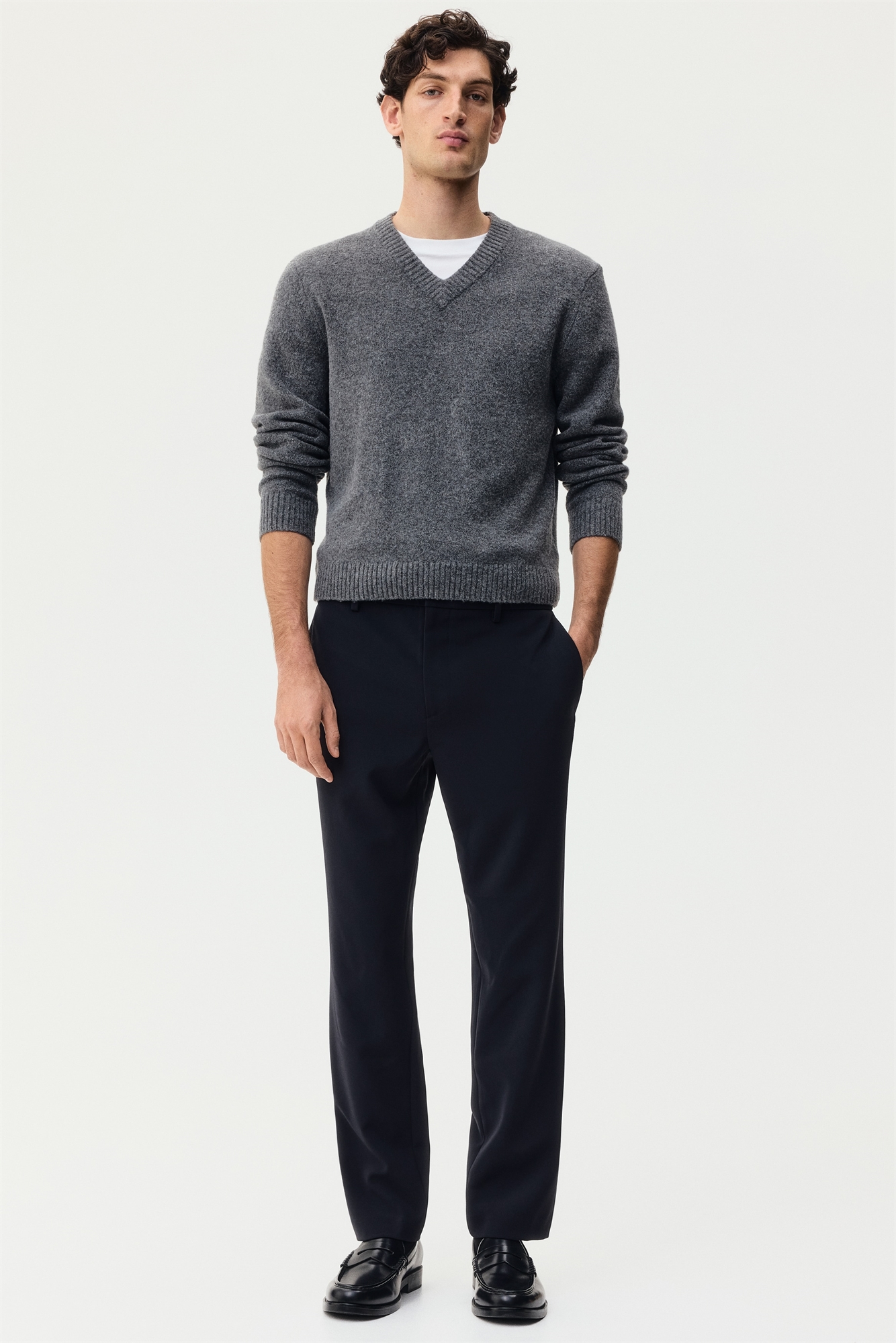 Приталенные брюки из мягкой ткани с ширинкой на молнии и пуговице, закрытой резинкой сзади на талии, диагональными боковыми карманами и втачными задними карманами. Зауженный крой, облегающий контуры тела и создающий приталенный силуэт.