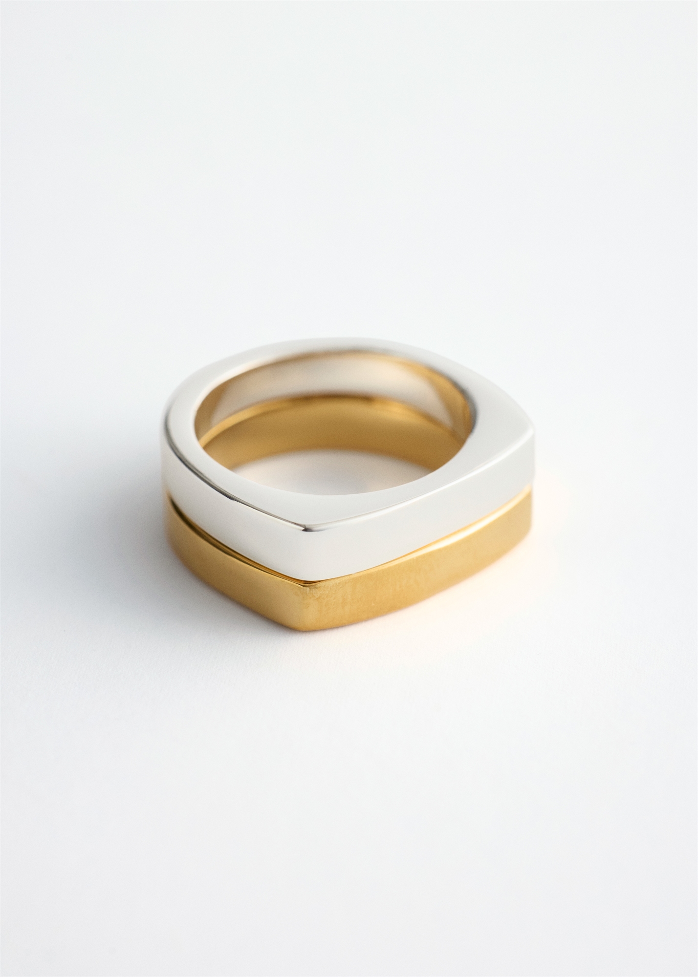 Этот набор из двух колец, изготовленный из полированной латуни, имеет современную угловатую форму и выглядит смело и современно.