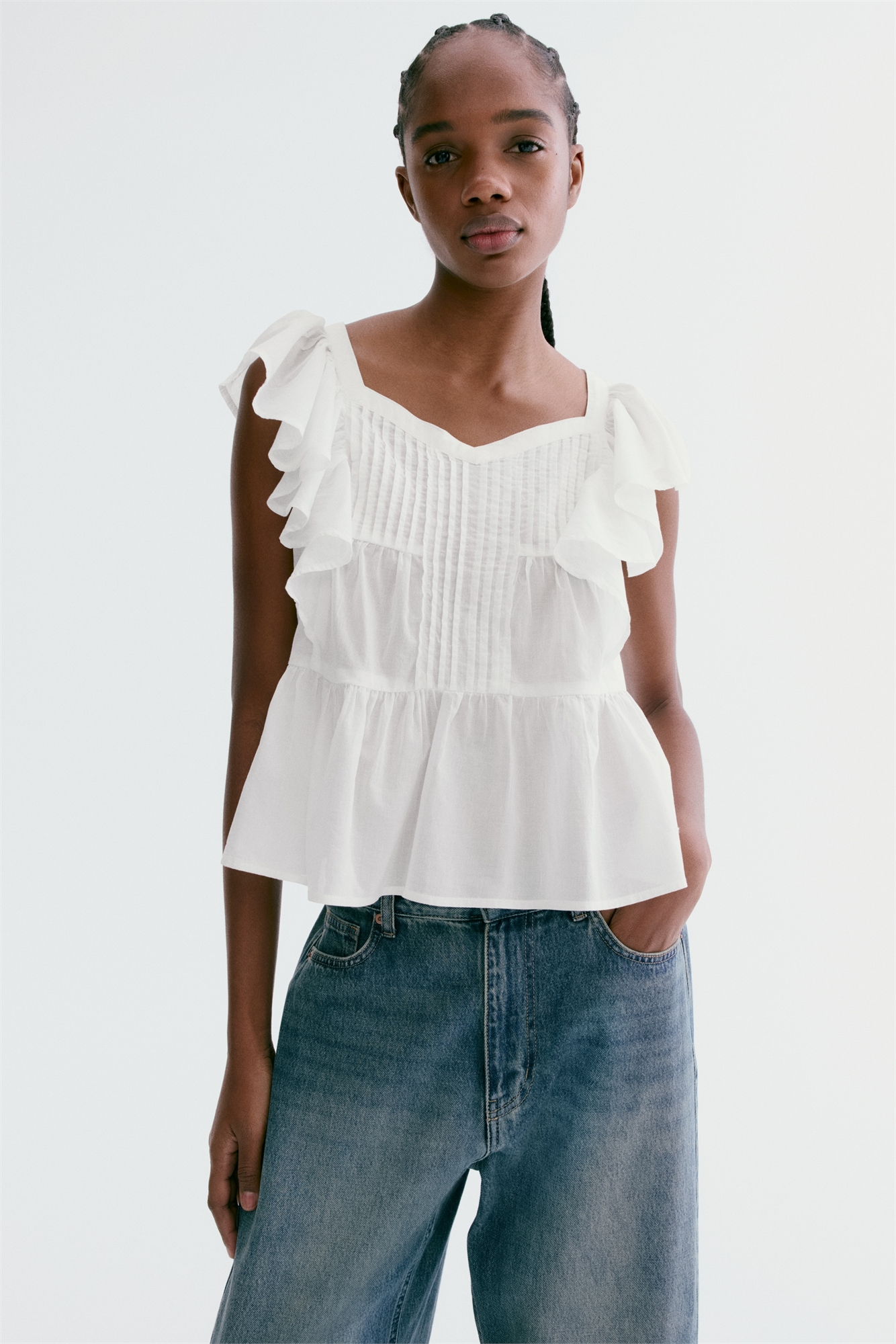 Топ без рукавов из легкого хлопкового полотна с заутюженными складками спереди. Декольте в форме сердца, оборки спереди, продолжающиеся по плечам и сзади, а также сборки на талии, создающие мягко расклешенный пеплум.