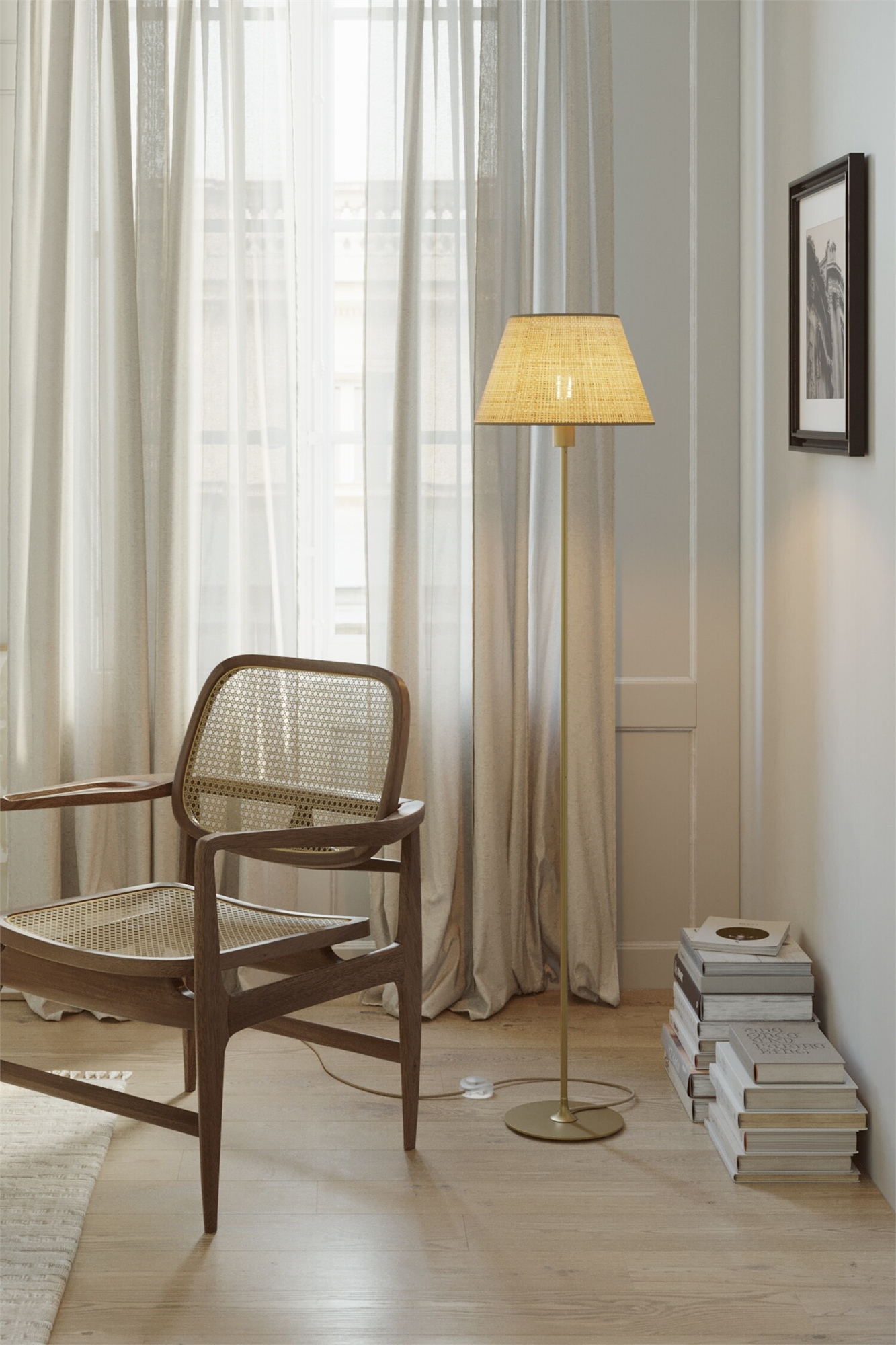 Торшер простого дизайна с металлическим основанием и абажуром из натуральной рафии. Кабель в тканевой оболочке с пластиковым выключателем. Цоколь E27. Лампочка в комплекте: 7 Вт 806 лм. Общая высота: 147 см. Длина кабеля: 200 см (50 см от выключателя до розетки и 150 см от вилки до выключателя) Примечание: Светильник поставляется в разобранном виде. Торшер легко устанавливается благодаря магнитной системе, соединяющей стержень с основанием. Для дополнительной устойчивости лампу следует закрепить стопорным винтом из комплекта поставки.