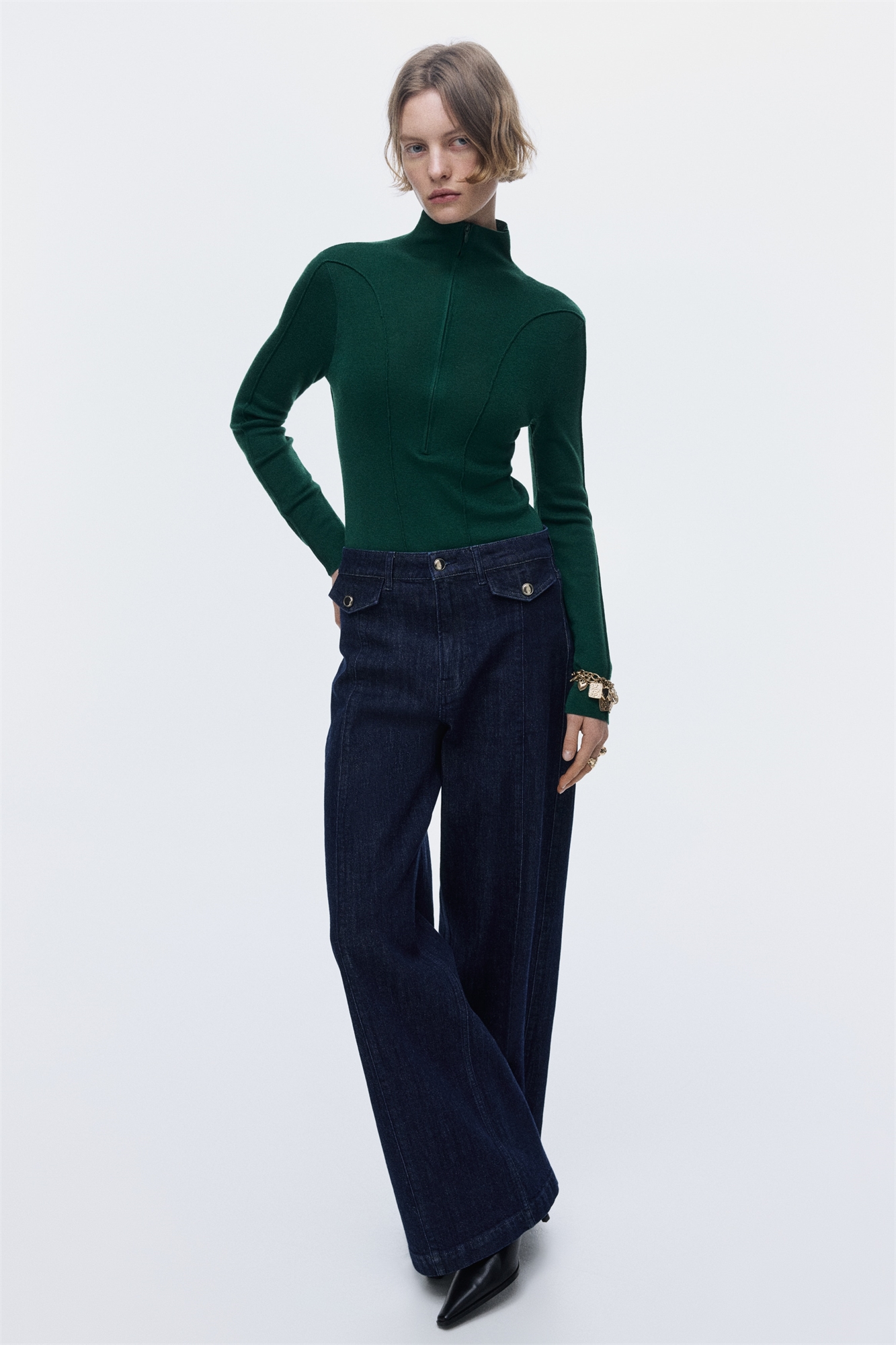Облегающий топ с длинными рукавами из мягкого тонкого трикотажа с водолазкой, потайной застежкой-молнией в верхней части и открытыми швами спереди и на рукавах.