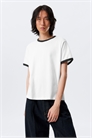 Футболка с короткими рукавами и контрастной отделкой. Изготовленная из мягкого хлопкового джерси, она имеет ребристую горловину, одинаковые края рукавов и чистый подол с двумя иглами. Минимальная вещь с тонким ретро-стилем.