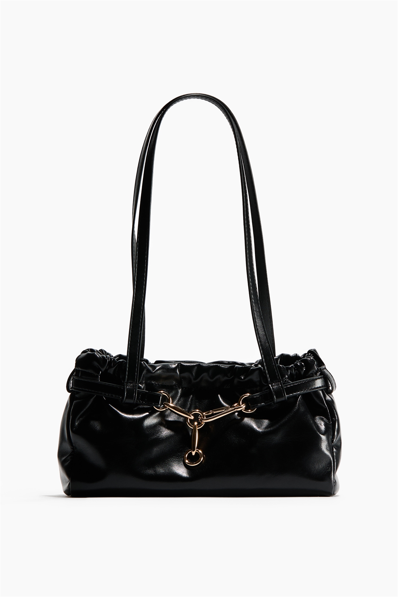 Сумка через плечо из мелованной ткани с узким ремешком вокруг верха, украшенным длинной металлической цепочкой и крючком-карабином спереди. Плечевые ремни в верхней части, скрытая магнитная застежка и шнурок вокруг отверстия с металлическими бусинами на концах шнурка. На подкладке.