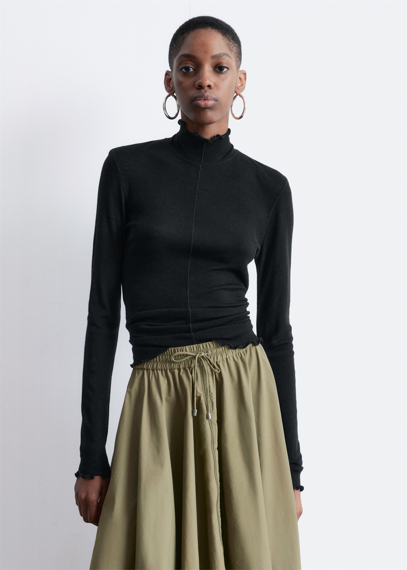 Этот топ с длинными рукавами тонкой вязки из шерстяной смеси имеет облегающий силуэт. Он имеет имитацию горловины, гребешковую отделку и плоский шов, проходящий по центру спереди и сзади. 60% шерсть RWS TE-00047206 Длина топа: 61,3 см / 24,1” (размер S)