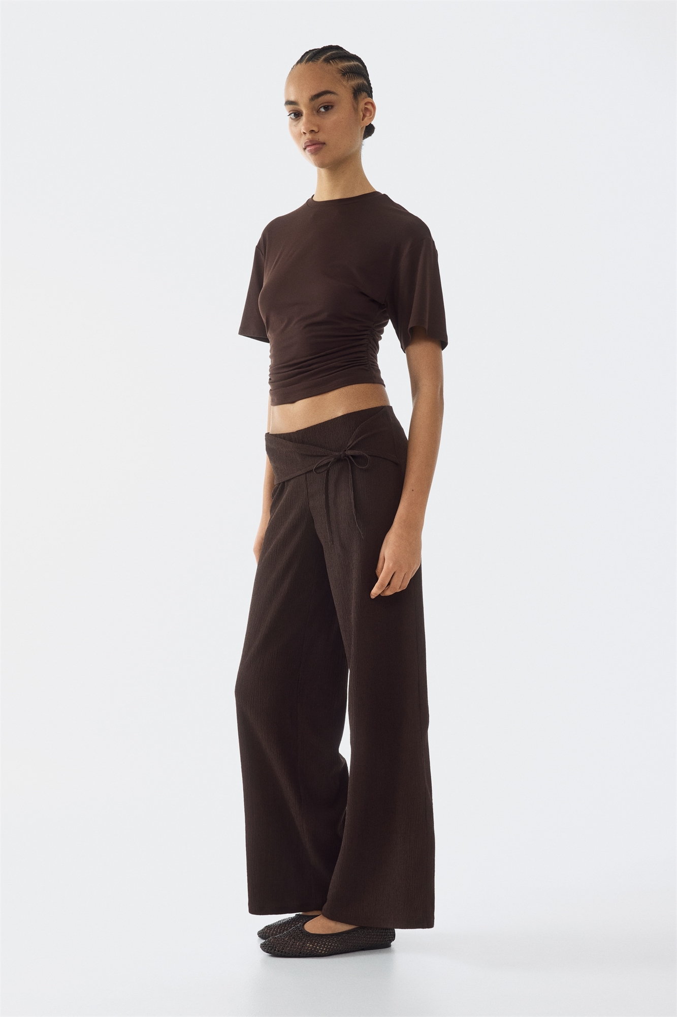 Брюки из текстурированного джерси с низкой талией, скрытой резинкой и широкой вставкой, имитирующей пояс, которая завязывается спереди. Прямые брючины.
