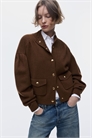 Кардиган оверсайз из мягкого трикотажа с ребристым воротником-стойкой, застежками на кнопки спереди и накладными передними карманами с застежкой на кнопки. Плечевые швы, направленные вперед, спущенные плечи и задний воротник со складками. Ребристые манжеты и подол, а также вставка с прижимной планкой с каждой стороны подола.
