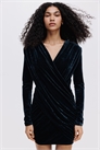 Облегающее мини-платье из мягкого велюра с накладными панелями спереди и сборками на плечах и по бокам для легкой драпировки. V-образный вырез, подплечники и длинные рукава.