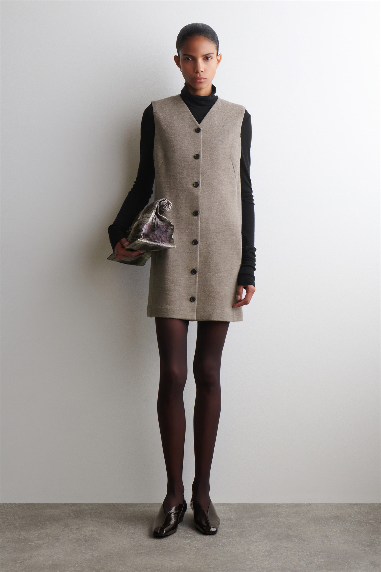 Это мини-платье может быть использовано в самых разных ситуациях. Созданное из смеси мериносовой шерсти, оно имеет тонкие карманы в боковых швах и пуговицы в стиле жилета спереди. Наденьте его поверх джемпера из тонкой ткани. Плотный кройЗастежка на пуговицыЭто изделие содержит шерстяное волокно Responsible Wool Standard TE-00047206 (RWS) с ферм, сертифицированных в соответствии с требованиями к благополучию животных и землепользованию Материал: 50% мериносовой шерсти, 32% хлопка, 18% переработанного полиэстера. Подкладка: 100% хлопок. Без учета отделки / Сухая чистка Длина по спинке для размера S составляет 82 см / Модель носит размер S
