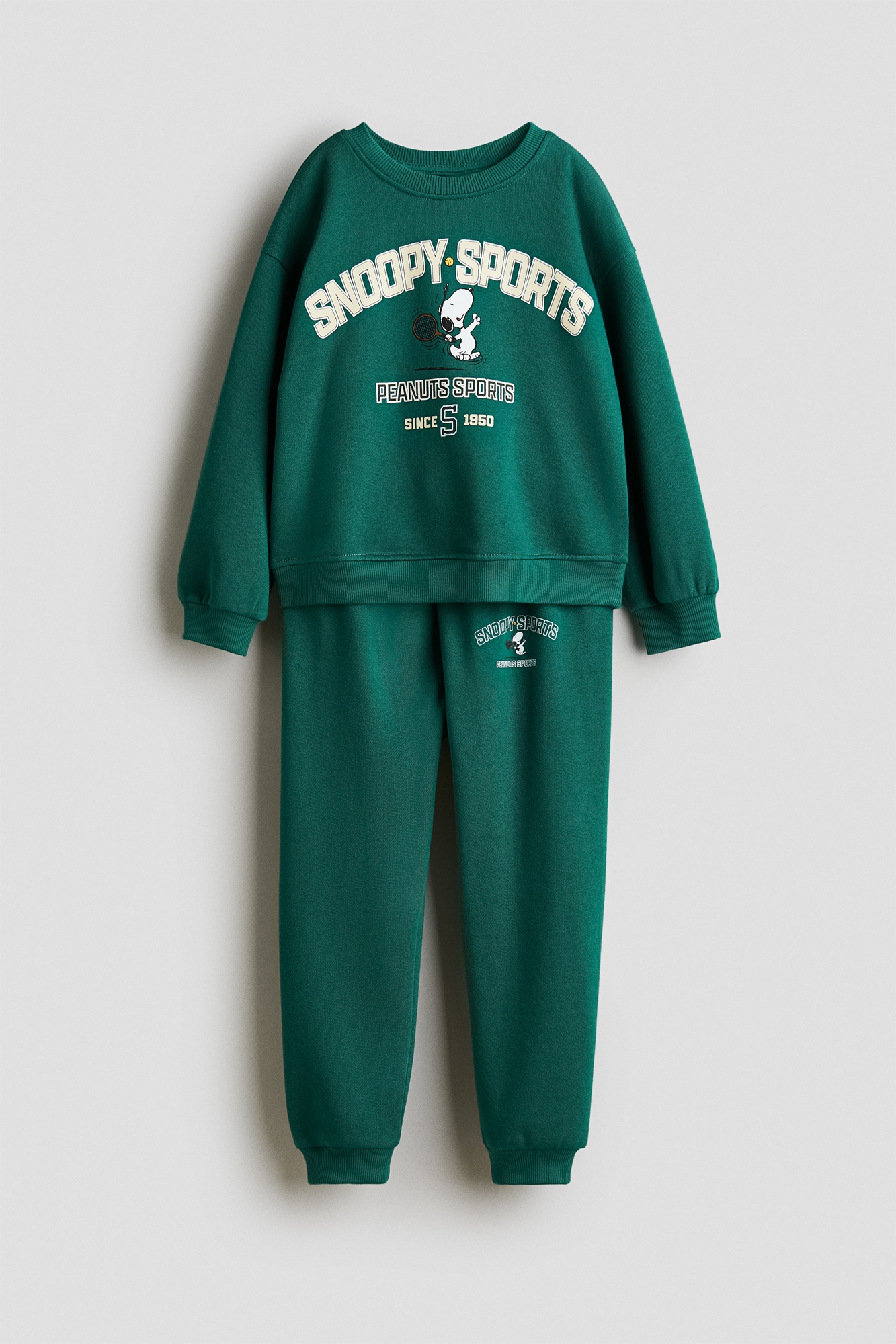 Комплект из набивного хлопкового свитшота, состоящий из топа и джоггеров. Топ с длинными рукавами, круглым вырезом с ребристой отделкой, спущенными плечами и окантовкой манжет и подола. Джоггеры с эластичной утягивающейся талией и ребристой отделкой по подолу.