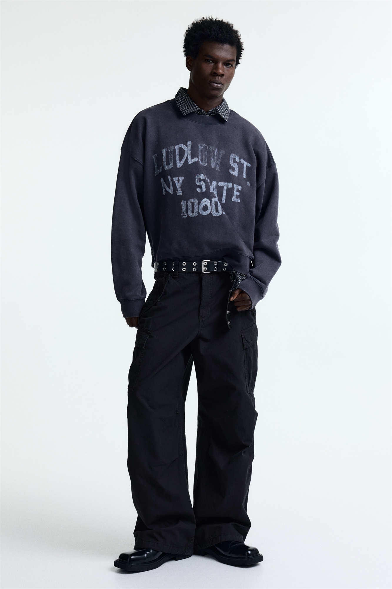 Брюки-карго из тканого материала с ширинкой на молнии и пуговице и внутренним шнурком на талии. Боковые карманы с клапанами, задние карманы с застежкой на крючок и петлю и карманы на штанинах. Вшитые складки на коленях и потайной шнурок на подоле. Свободный крой для пышного, но не чрезмерно большого силуэта.