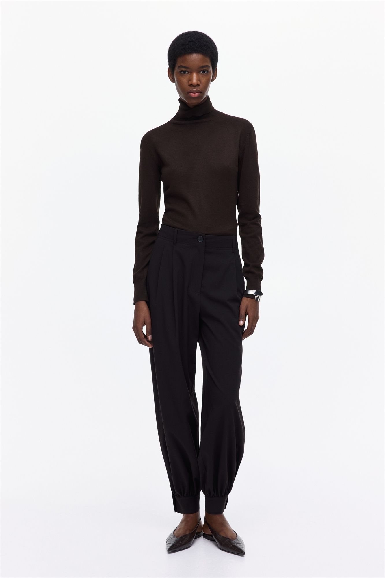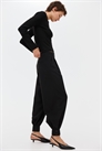 Свободные брюки из тканого материала с ширинкой на молнии и пуговице, диагональными боковыми карманами и втачным карманом с пуговицей сзади. Ноги-баллоны со складками спереди и облегающие подолы с разрезом и пуговицами.