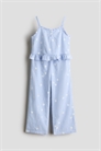 Комплект из топа и брюк из легкого хлопка сеерсакера. Топ с узкими бретелями и квадратным вырезом с отверстием в форме ключа и пуговицами спереди. Окантовка из оборок по верху и низу. Брюки с эластичным поясом и широкими брючинами с окантовкой из оборок.