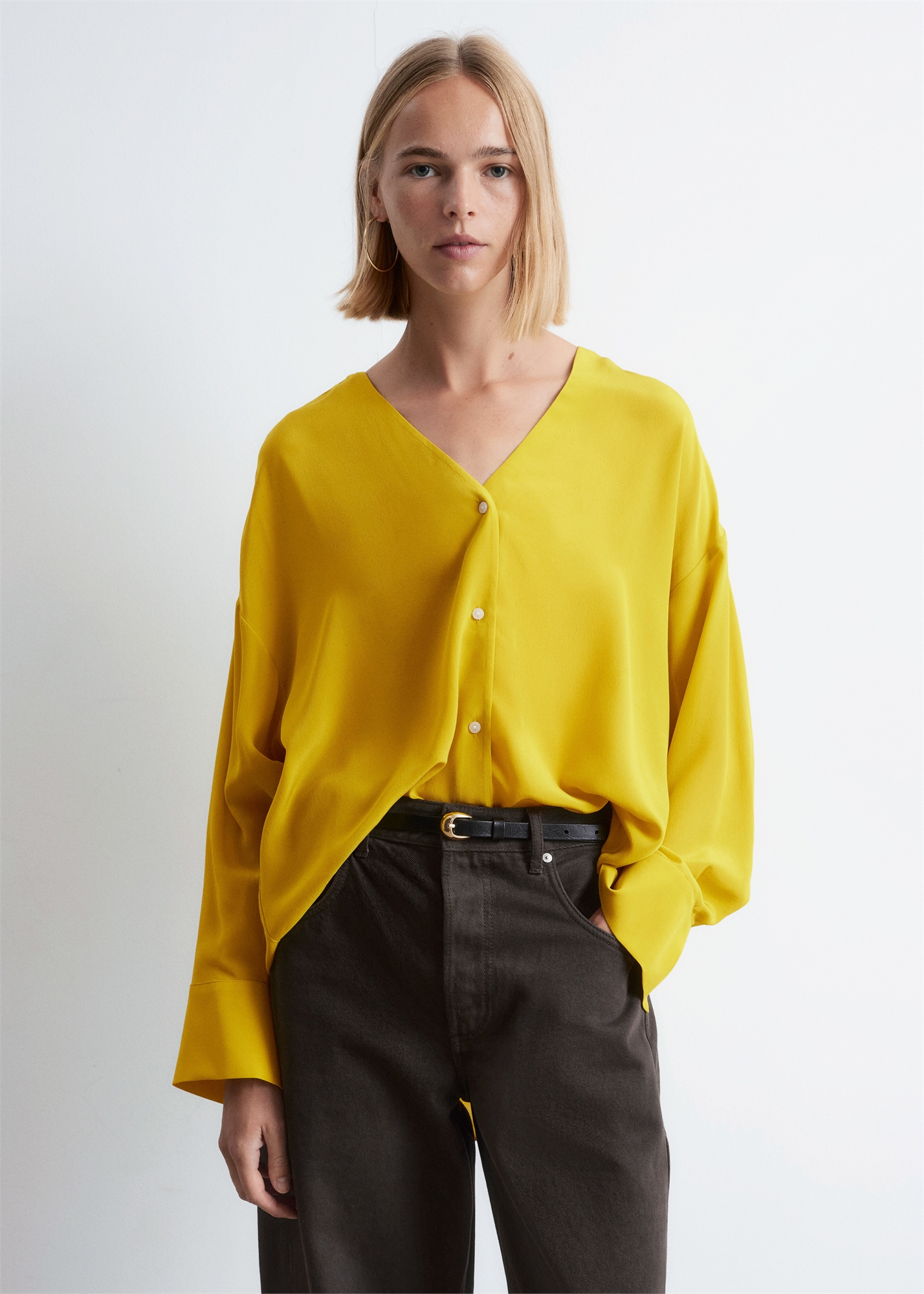 Эта блузка изготовлена из 100% шелка тутового дерева. Блуза имеет удлиненный силуэт оверсайз с плавной драпировкой и закругленным подолом. V-образный вырез, длинные рукава с манжетами на пуговицах и пуговицы спереди. Длина блузки: 78,4 см / 30,8” (размер S)